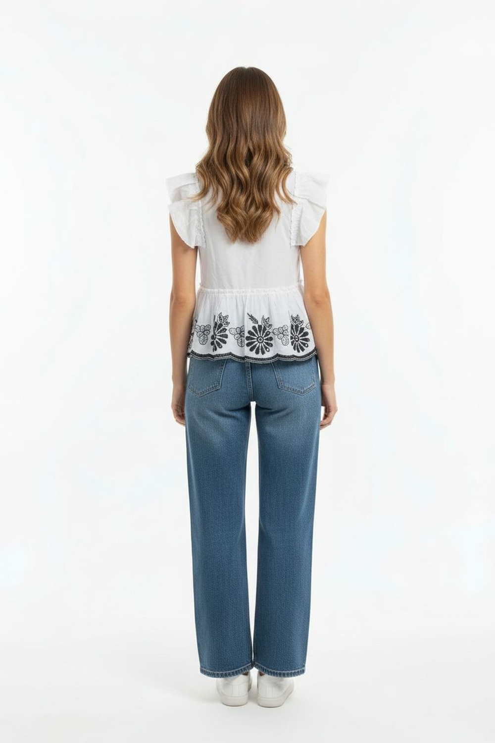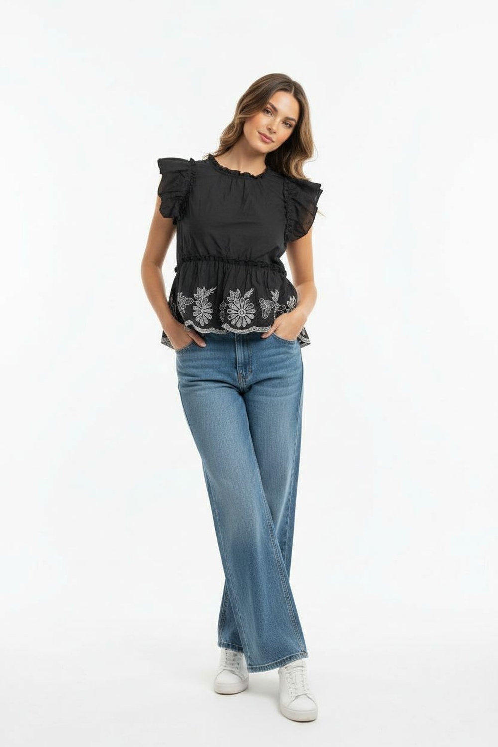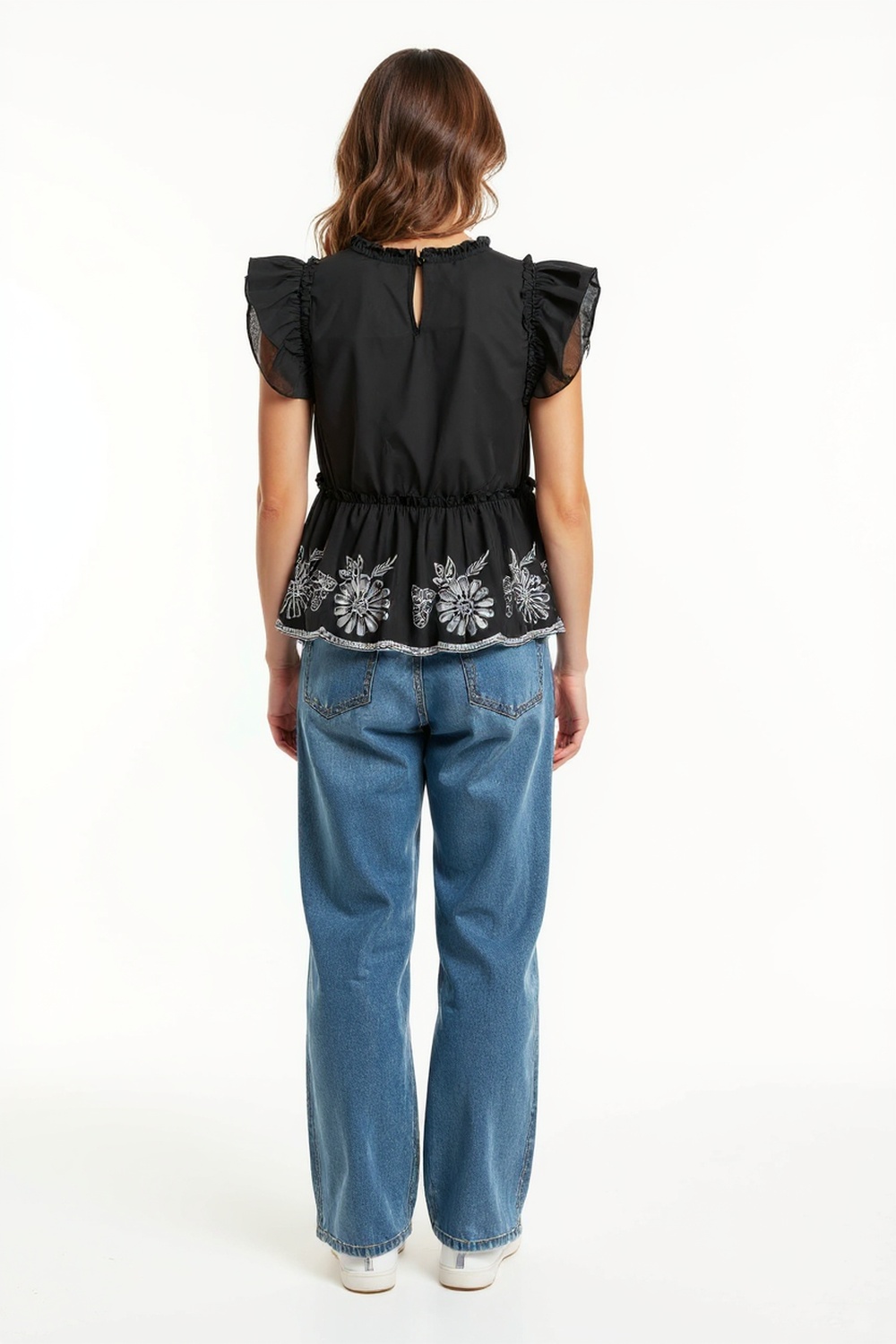 Blusa amplia con manga corta de olanes escote redondo detalle fruncido y acabado decorativo en parte inferior con textura ligera