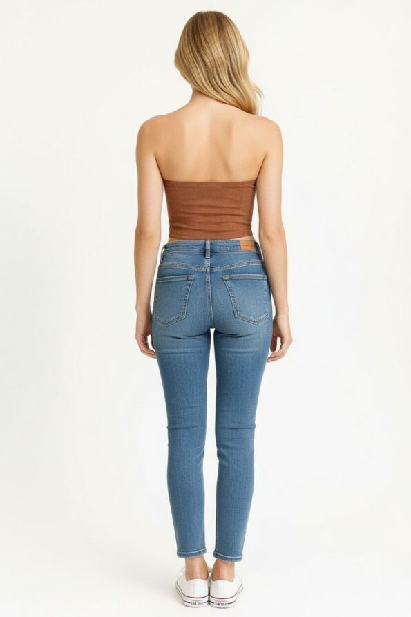 Top tipo banda con copas preformadas que brindan soporte y realce, diseño con cortes estructurados que definen la figura, confeccionado en tejido sweed de tacto suave que aporta un acabado elegante, parte posterior con elástico oculto para un ajuste cómodo, costuras finas que ofrecen un acabado limpio y moderno