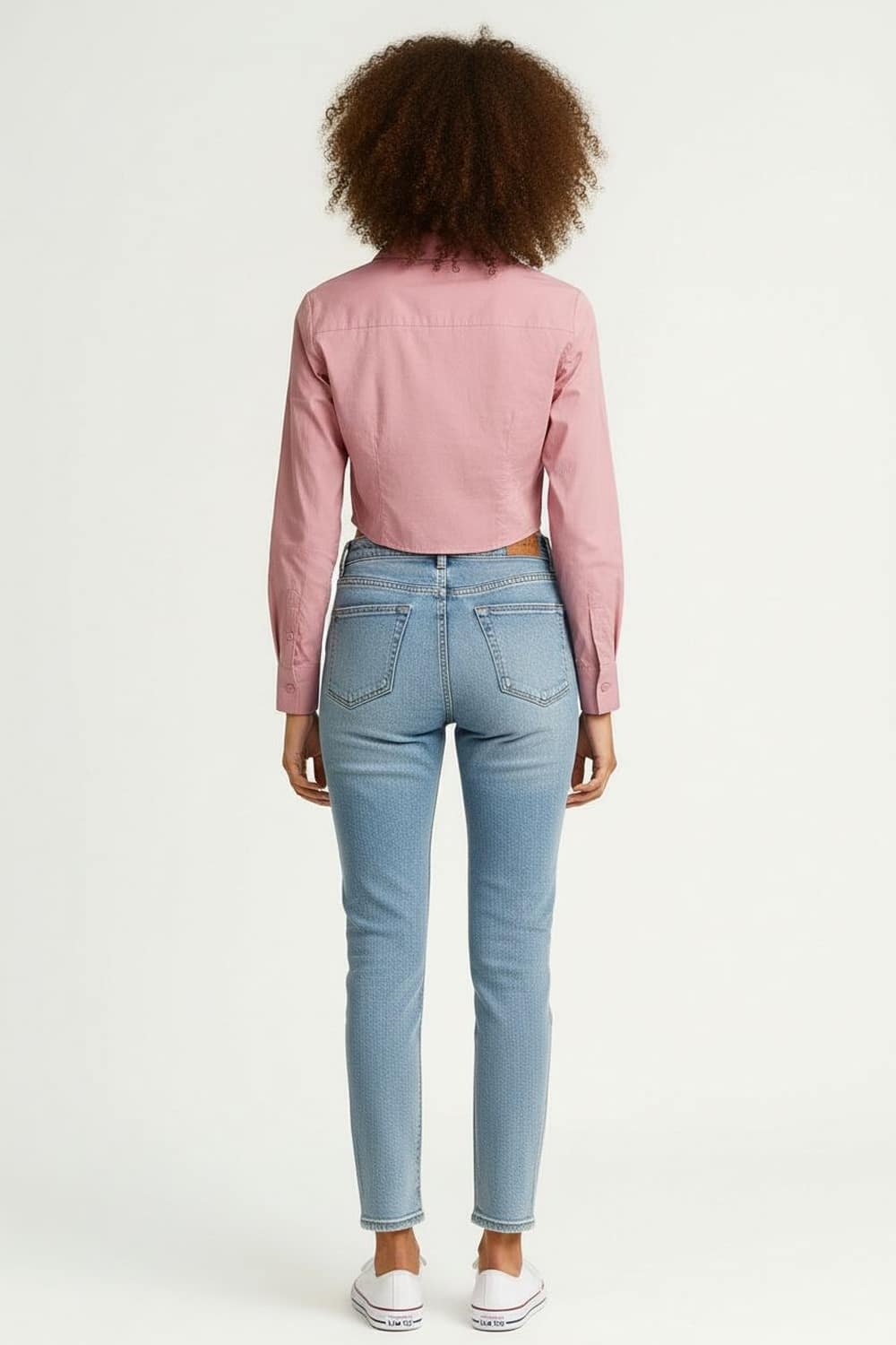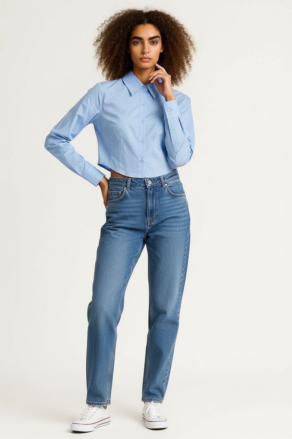Blusa con cuello camisero estructurado que aporta acabado pulido, botonadura frontal alineada que permite ajuste cómodo, mangas largas con puño de botón que ofrecen soporte, silueta corta con costura firme en contorno que define el diseño, confección en tejido plano que proporciona firmeza y sensación ligera