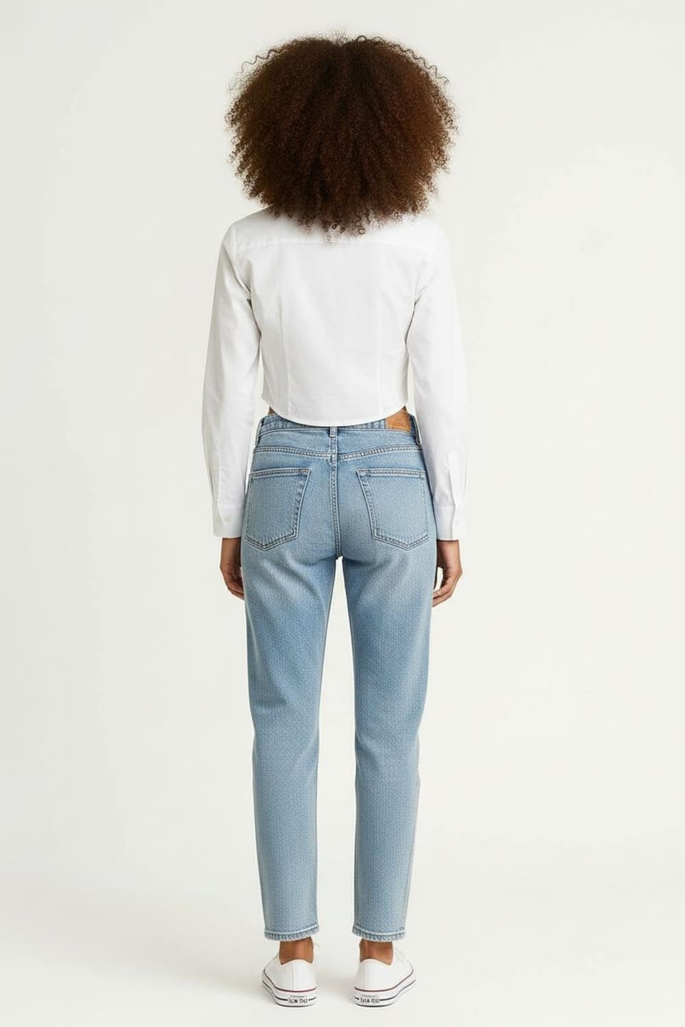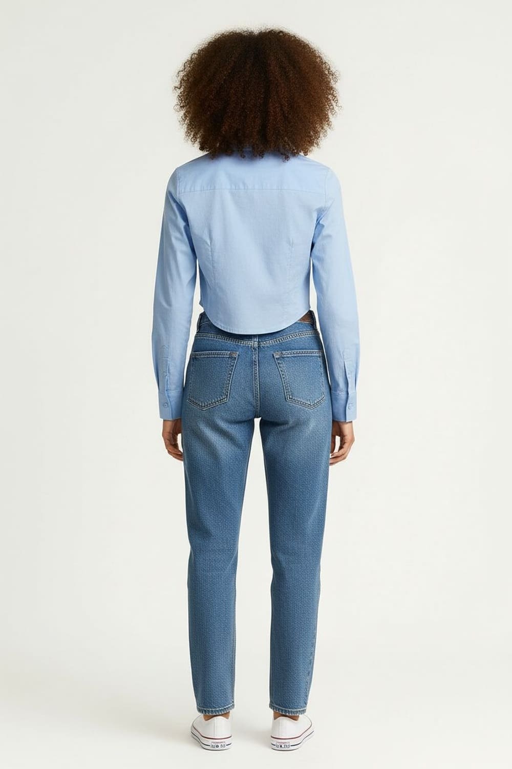 Jeans de tiro alto con corte de pierna amplia que aporta comodidad y estructura, pretina firme con botón metálico y pasadores que permiten ajuste seguro, cinco bolsillos funcionales con acabado resistente, fabricación en mezclilla de grosor medio que brinda soporte y mejor caída