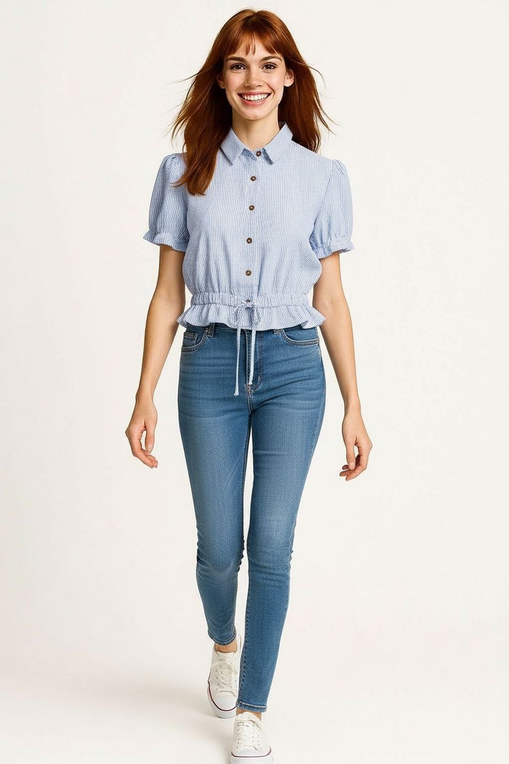 Blusa camisera con cuello clásico y botonadura frontal funcional que aporta estructura, manga corta con ligero volumen que da forma al brazo, jareta en cintura que permite ajustar el entalle, corte a la cintura que estiliza la figura, confección ligera que brinda comodidad para uso diario