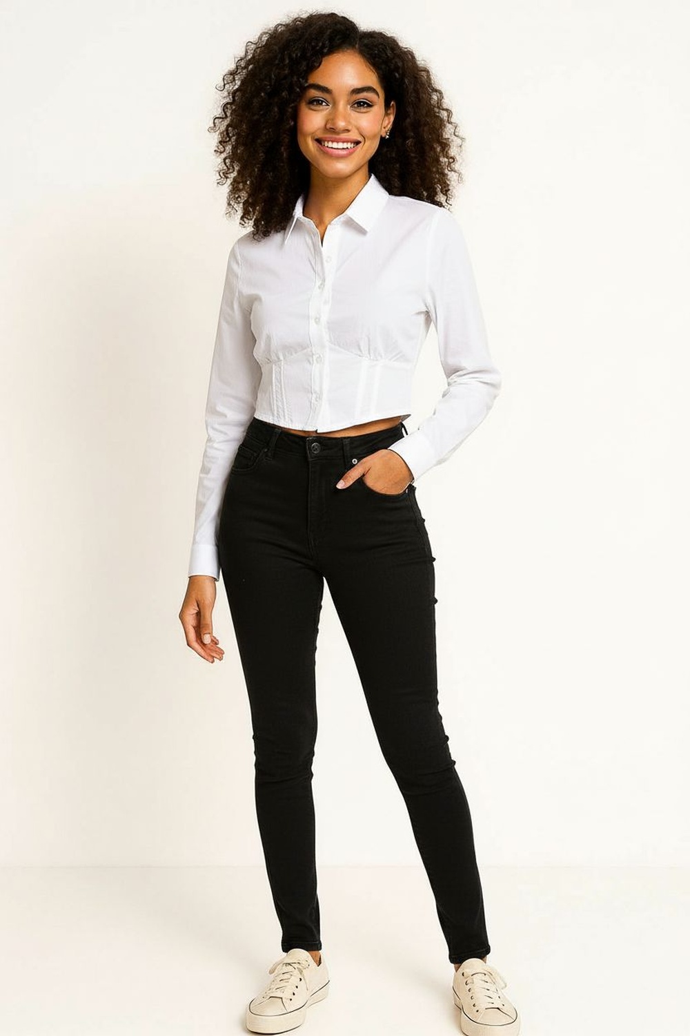Blusa crop tipo camisera confeccionada en tela popelina de tacto ligero y fresco, cuello clásico que aporta un acabado formal, botones al frente que permiten cierre práctico y elegante, pinzas y cortes en cintura que definen la silueta y realzan la figura, mangas largas ajustadas con puño sencillo que añaden un toque versátil, ideal para combinar en outfits casuales y de oficina con un aire moderno