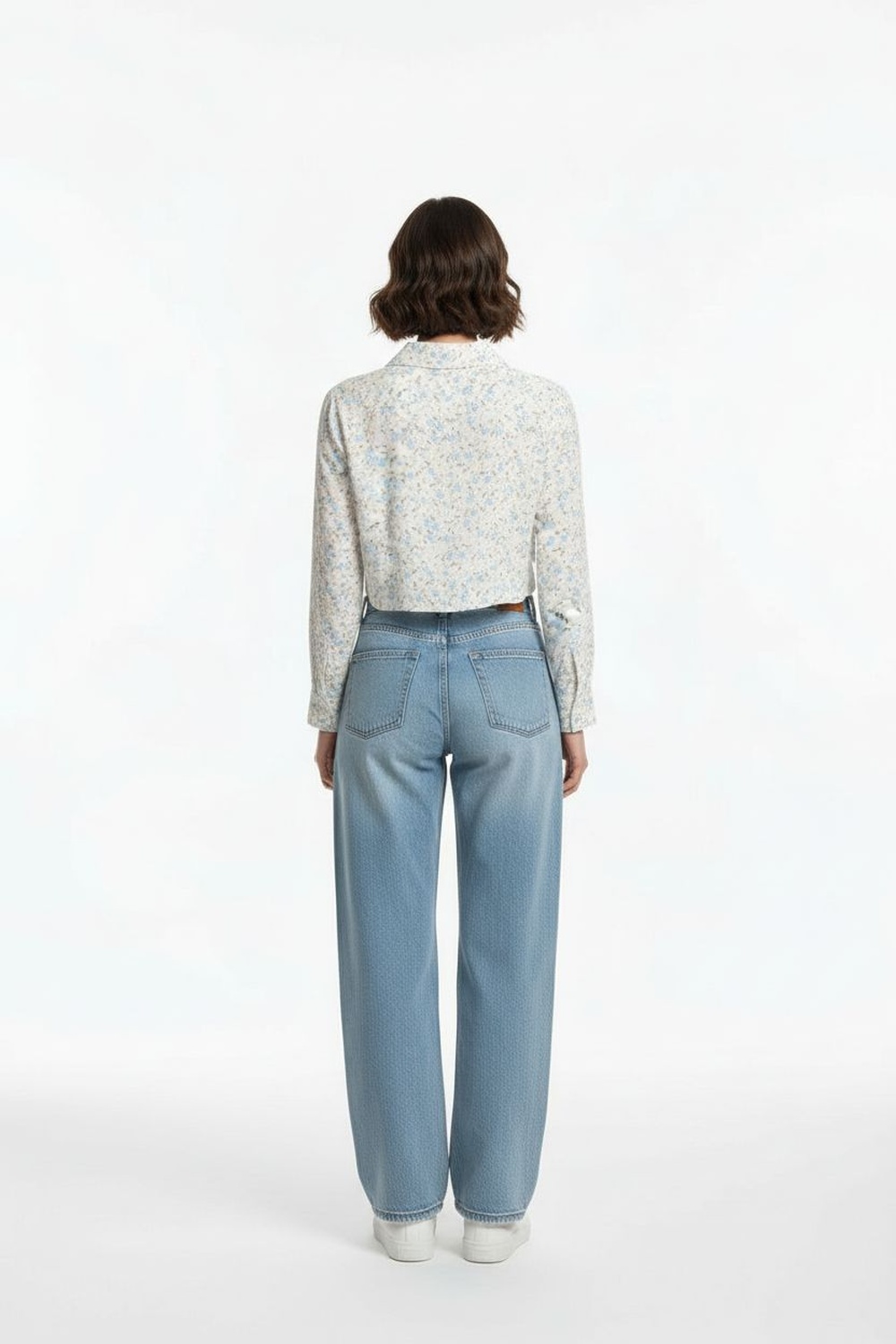 Blusa camisera con cuello, manga larga, botonadura frontal, corte corto, estructura ligera, ajuste recto al cuerpo