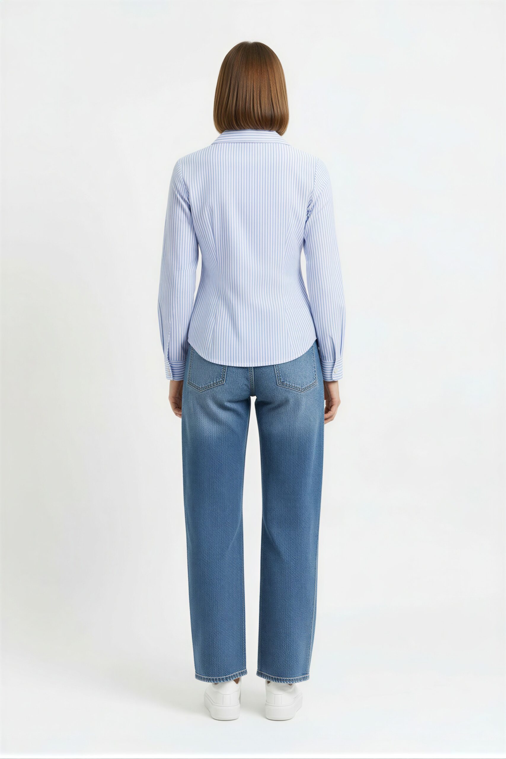 Blusa camisera con cuello clásico, cierre frontal con botones, manga larga con puño ajustado, corte recto con ligera amplitud en bajo, confección ligera y cómoda para uso diario