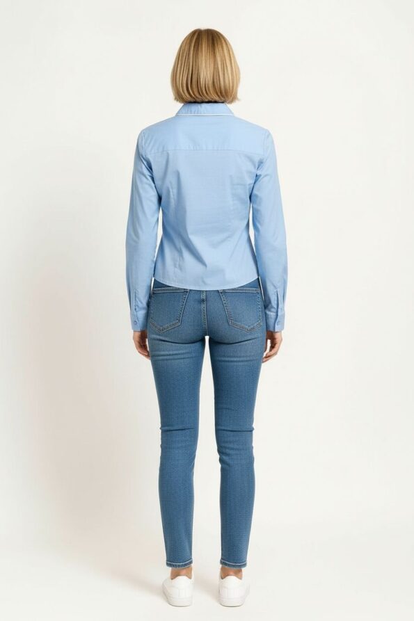 Blusa crop tipo camisera confeccionada en tela popelina de tacto ligero y fresco, cuello clásico que aporta un acabado formal, botones al frente que permiten cierre práctico y elegante, pinzas y cortes en cintura que definen la silueta y realzan la figura, mangas largas ajustadas con puño sencillo que añaden un toque versátil, ideal para combinar en outfits casuales y de oficina con un aire moderno