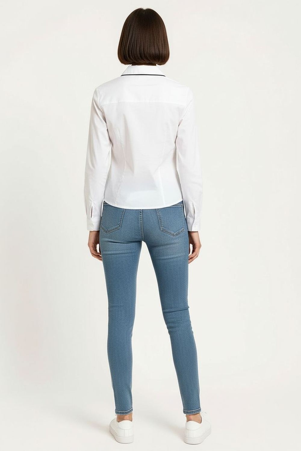 Blusa de manga larga confeccionada en popelina ligera que aporta frescura y estructura, cuello camisero con detalle de ribete en contraste que realza el diseño, cierre frontal con botones que ofrece practicidad y acabado clásico, puños con botón que permiten un ajuste cómodo y elegante, largo a la cintura que brinda un look versátil y moderno