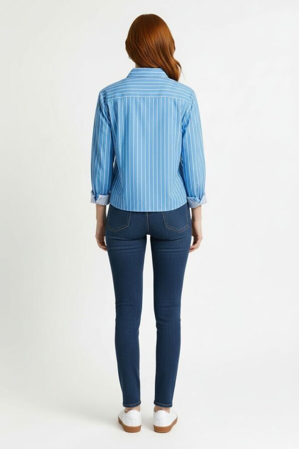 Blusa crop tipo camisera confeccionada en tela popelina con diseño a rayas que aporta un look moderno, cuello clásico que brinda un acabado versátil y formal, botones al frente que permiten un cierre práctico y elegante, manga larga con opción de ajuste en dobladillo para mayor comodidad, corte recto con caída ligera que favorece distintos tipos de silueta, ideal para outfits casuales y de oficina