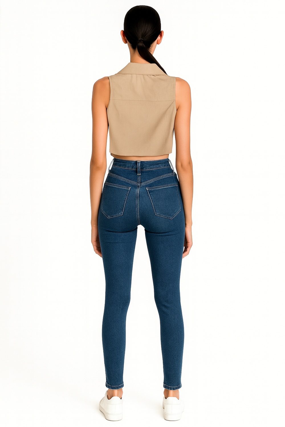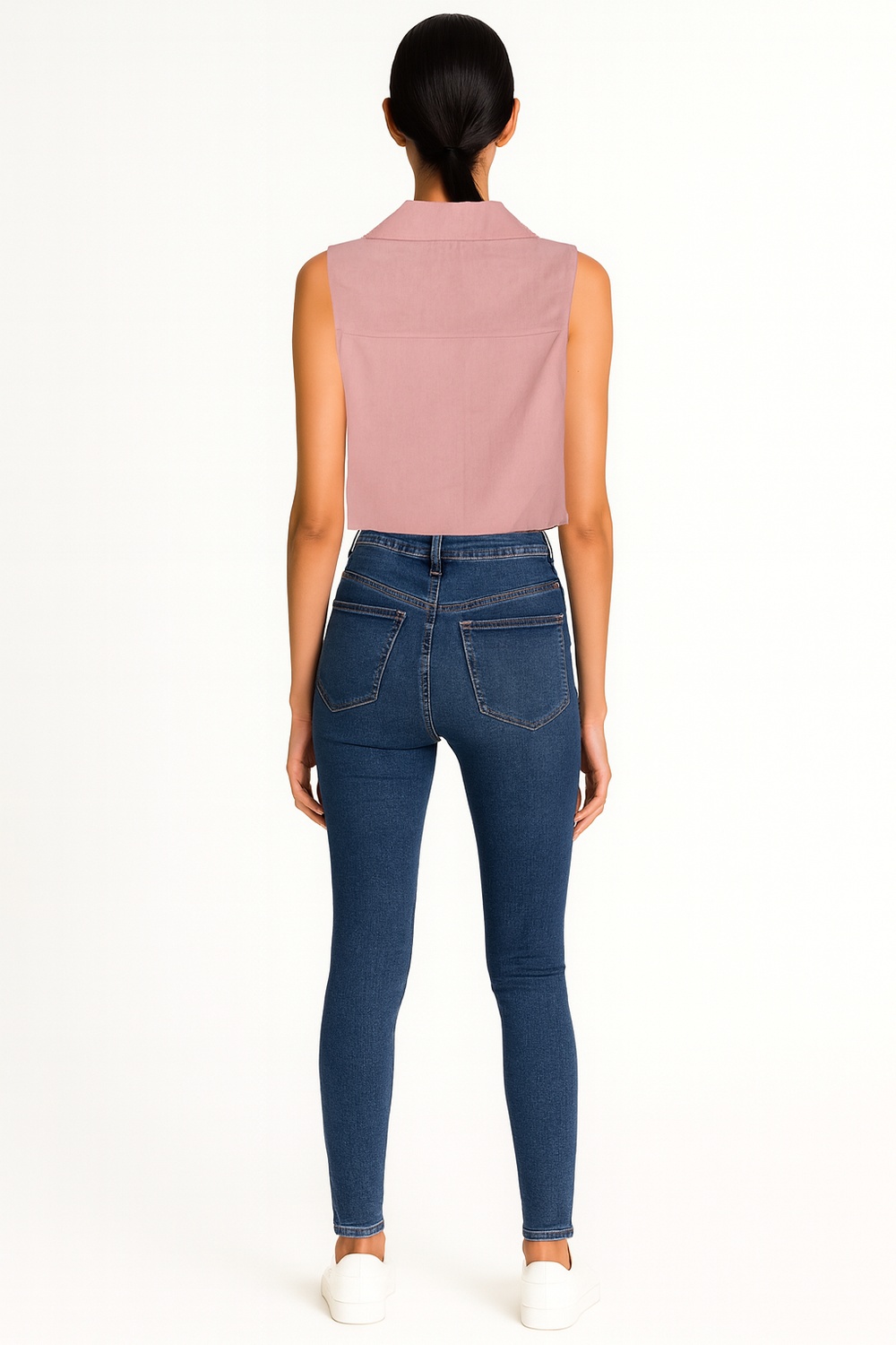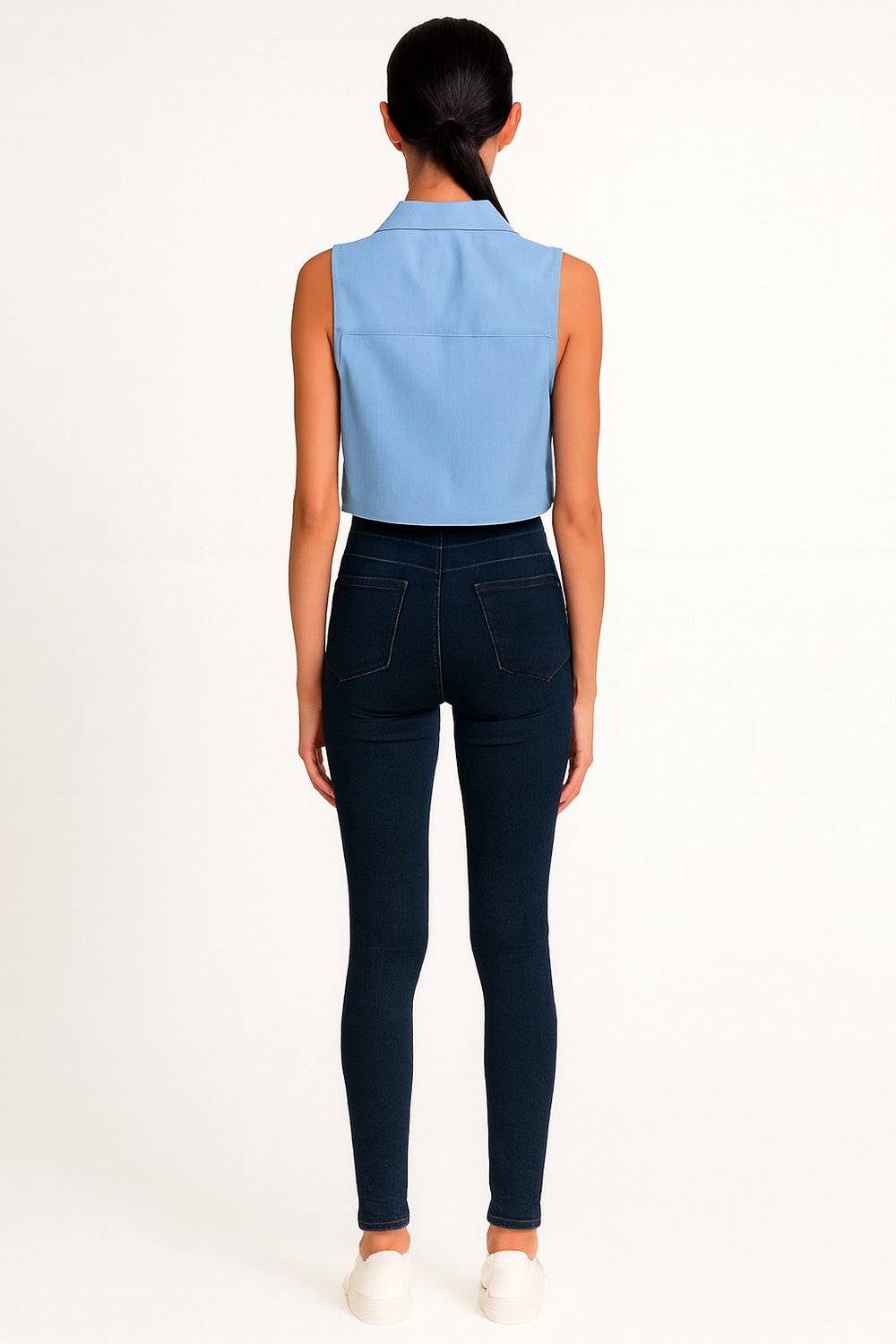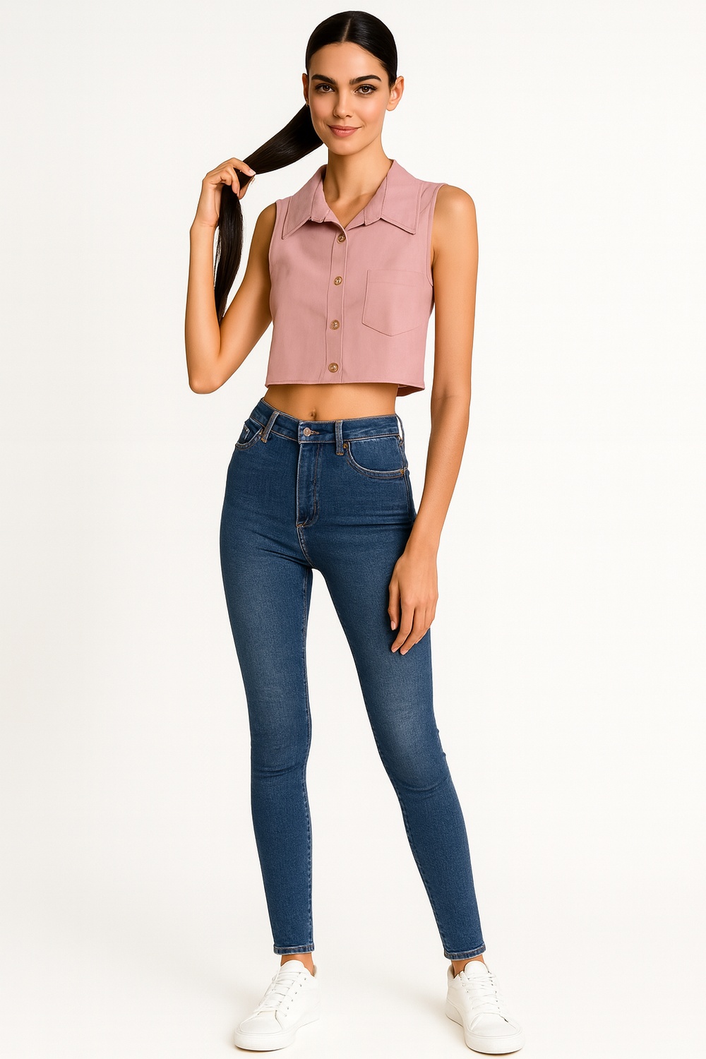Blusa camisera sin mangas con cuello clásico y botonadura frontal funcional, corte recto con largo a la cintura que aporta versatilidad, confección en tejido tipo lino con textura fresca y ligera, bolsillo frontal como detalle funcional