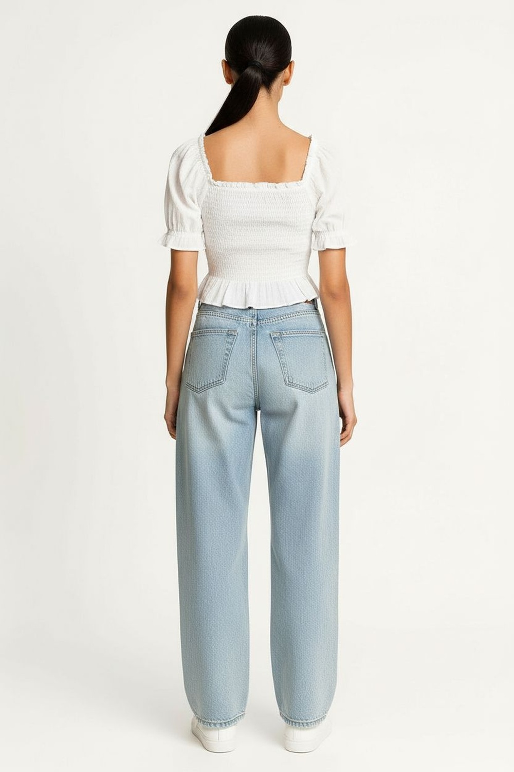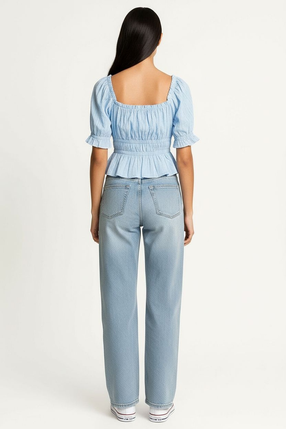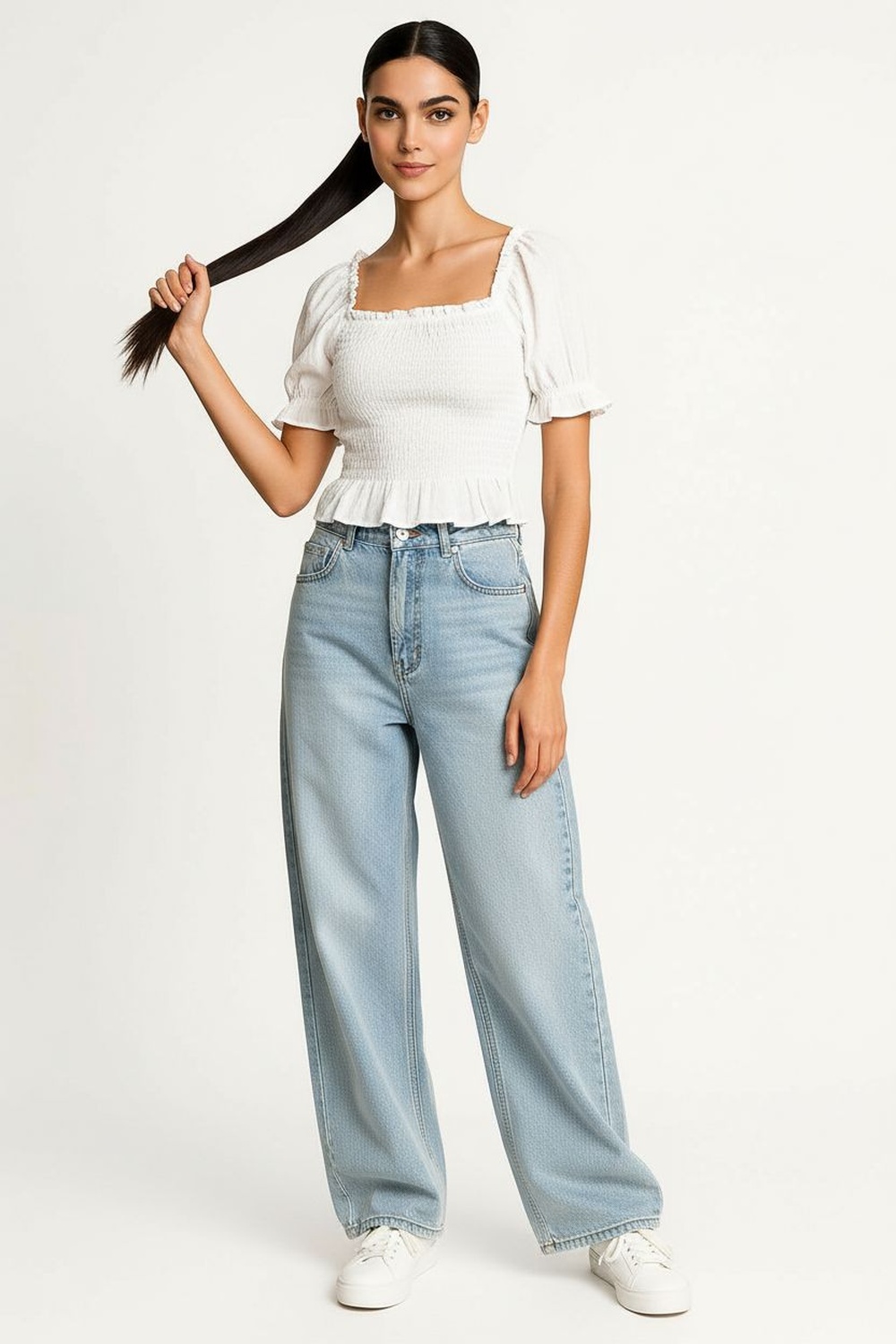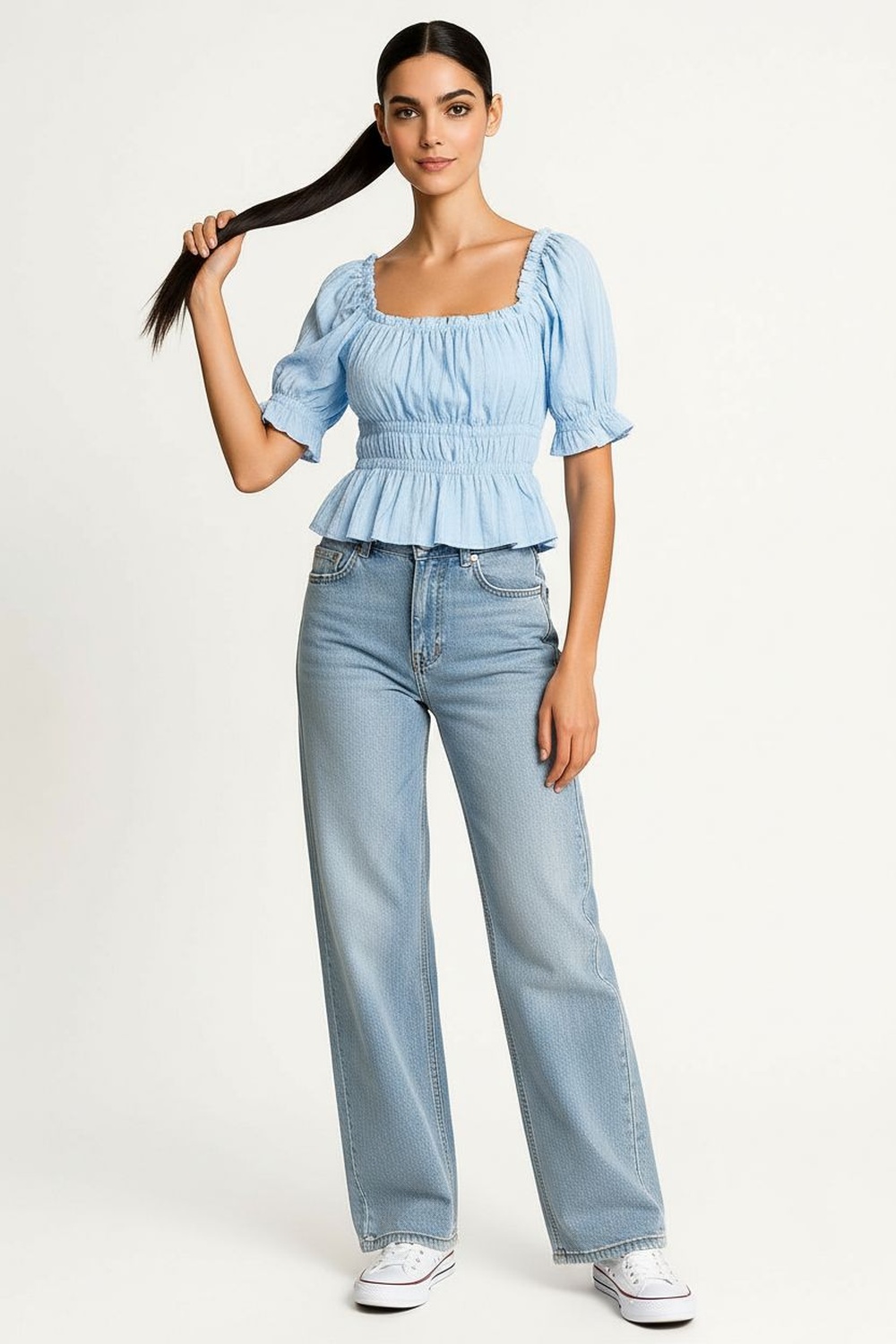 Blusa de escote amplio con elástico integrado que permite ajuste versátil, manga corta abullonada con puño fruncido que aporta volumen equilibrado, cuerpo con panel smock en cintura que define la figura y faldón ligero con vuelo que brinda frescura y comodidad