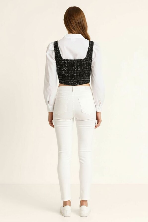 Blusa de manga larga con cuello camisero clásico que aporta elegancia, diseño combinado con chaleco integrado de corte recto que añade contraste y modernidad, confección en tejido ligero y suave que brinda comodidad durante el día, botones al frente que aseguran practicidad, ideal para outfits formales y combinaciones modernas de temporada