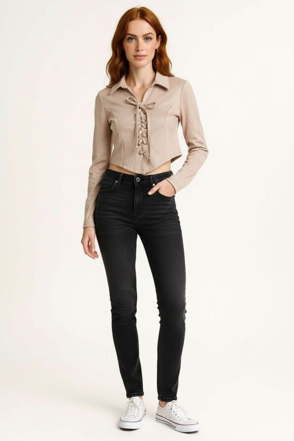 Blusa con cuello camisero estructurado que aporta un toque moderno, detalle de jareta con ojillos al frente que permite ajustar el escote y resalta el diseño, corte entallado con terminación curva que estiliza la silueta, confeccionada en tejido tipo gamuza de tacto suave que brinda comodidad y elegancia en cada uso