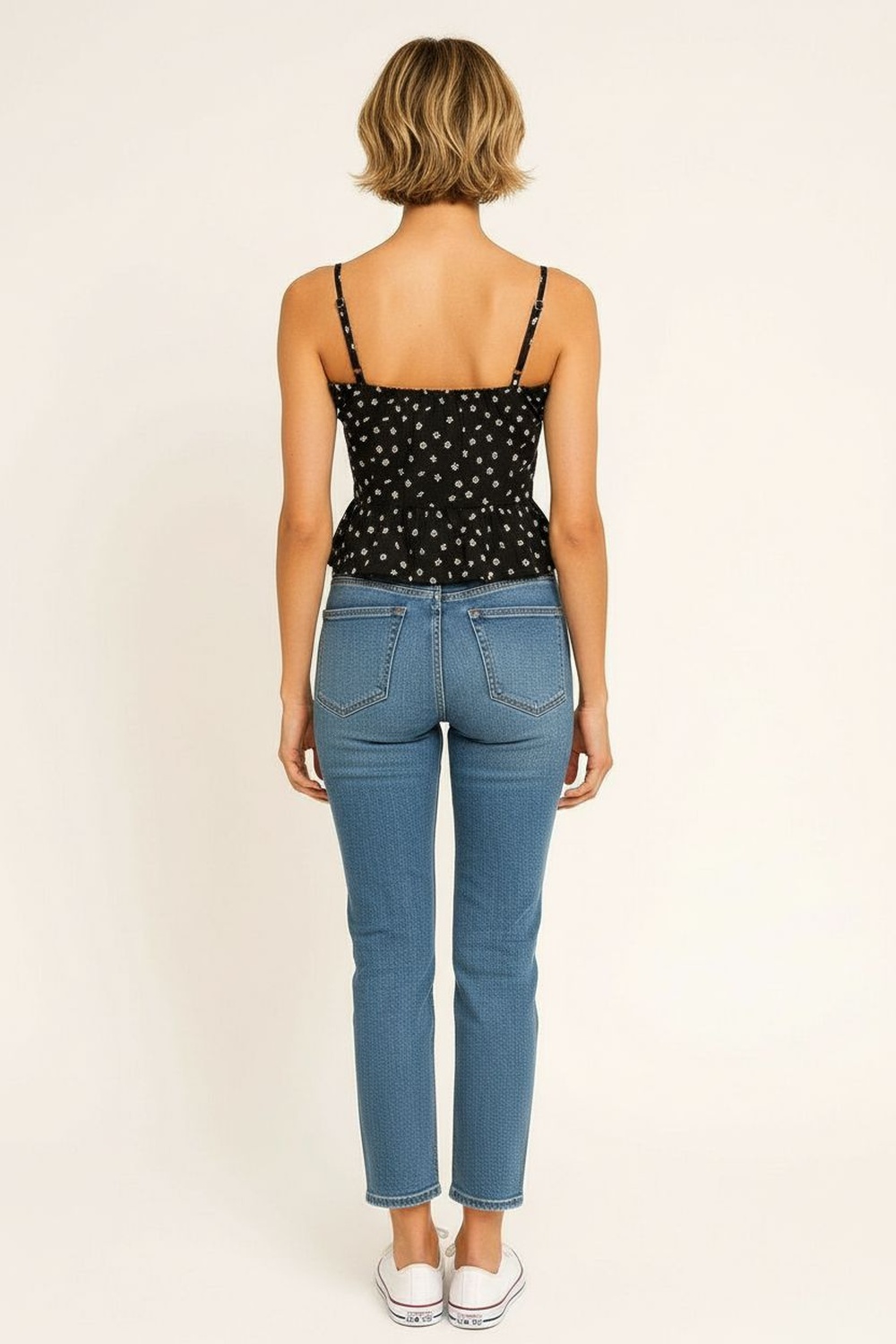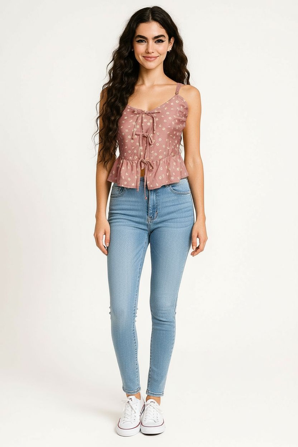 Blusa de tirantes delgados ajustables con escote recto y detalle de amarre frontal regulable, corte a la cintura con ligero vuelo inferior que aporta movimiento, confección ligera de textura suave que permite frescura, estructura cómoda que se adapta al contorno sin perder forma