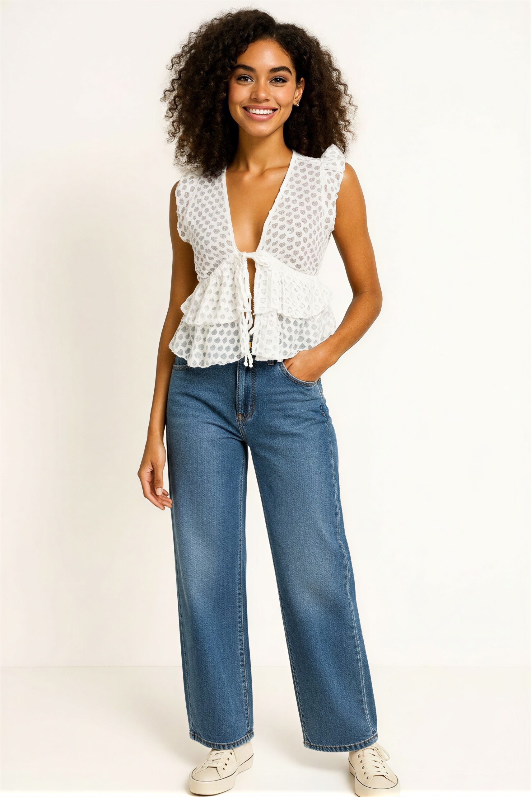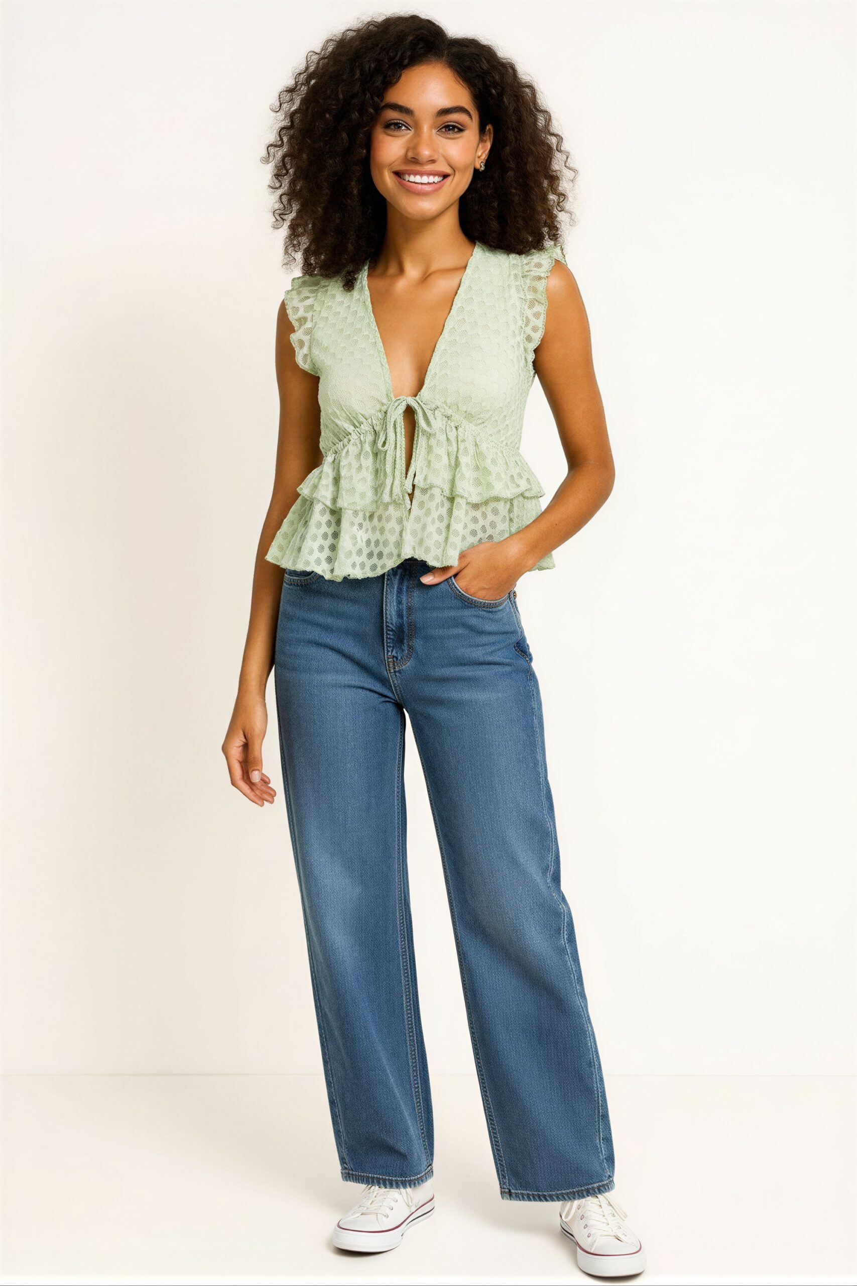 Blusa tipo halter con escote profundo, ajuste al cuello con lazo posterior, estructura ligera, caída suave, terminado con vuelo en el bajo