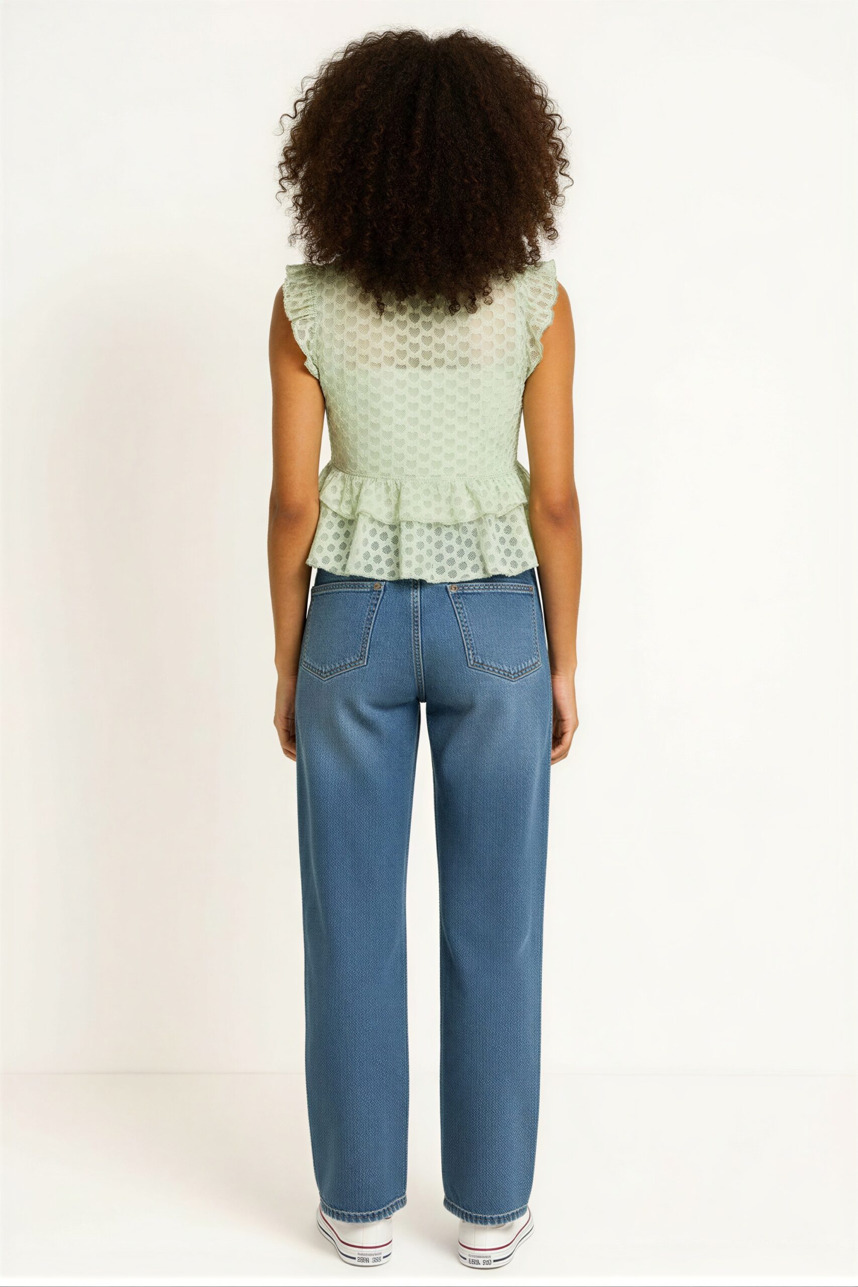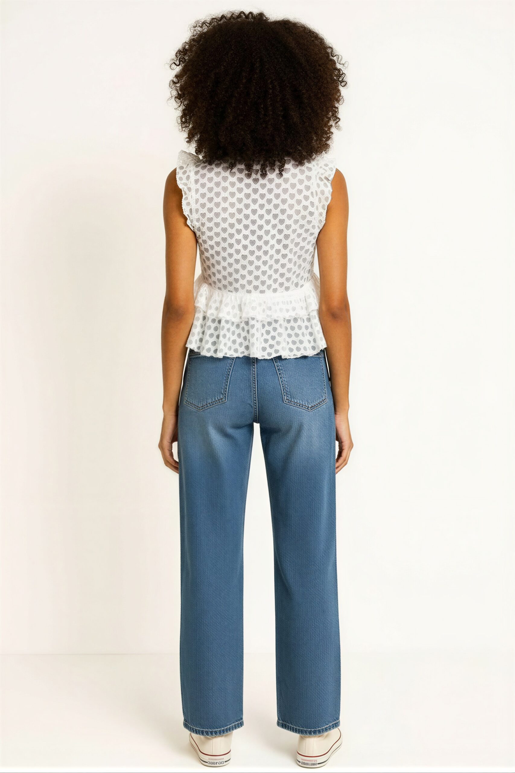 Pantalón de tiro medio con cierre frontal y botón, bolsillos funcionales, corte amplio en pierna, ajuste cómodo, terminado recto
