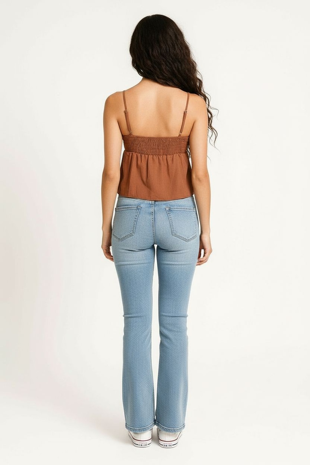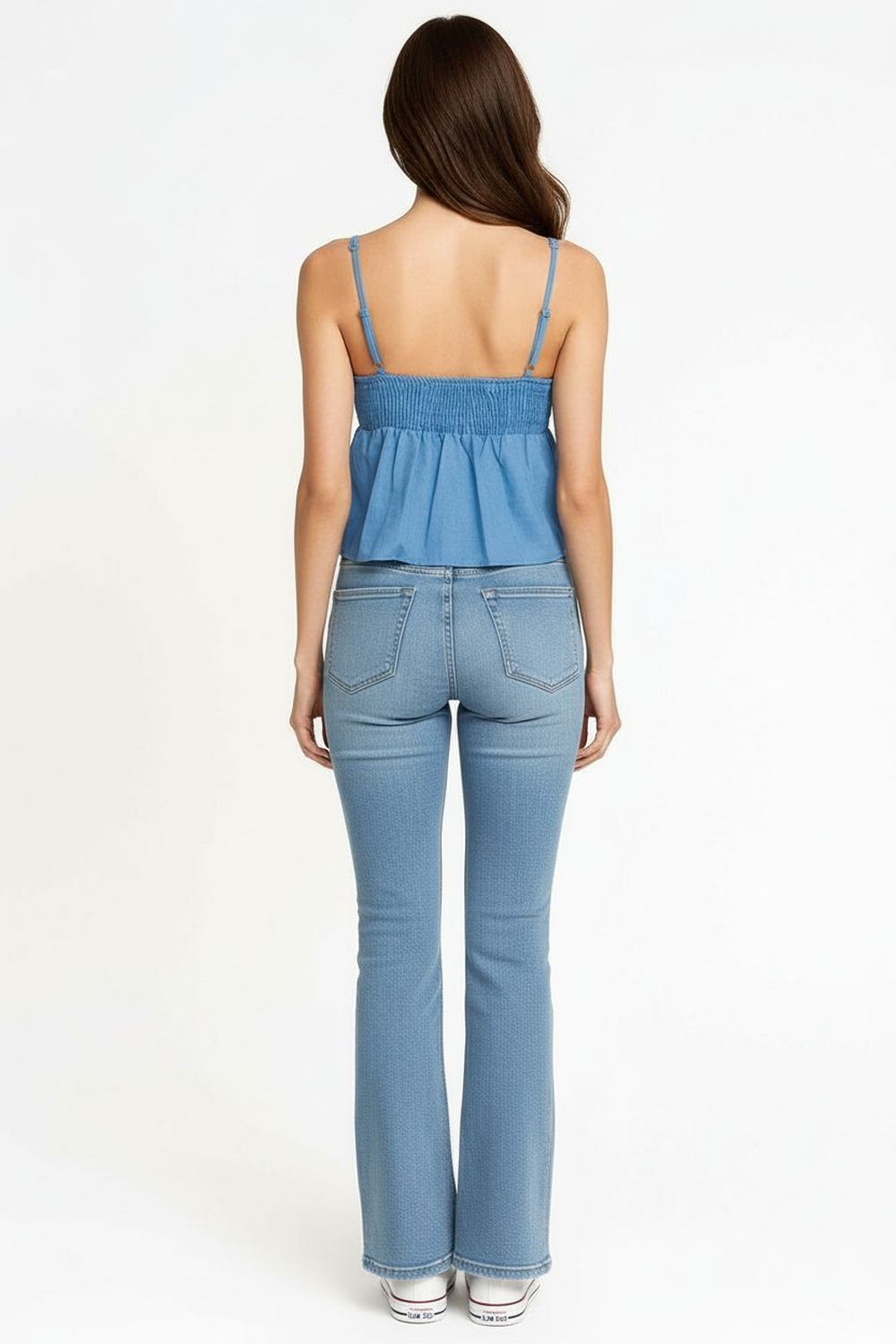 Blusa tipo halter con escote recto y tirantes delgados, corte a la cintura con faldón amplio que genera volumen en la parte baja, confección en popelina de tacto firme y ligero, estructura definida en busto que brinda mejor soporte, terminación con vuelo suave que aporta movimiento