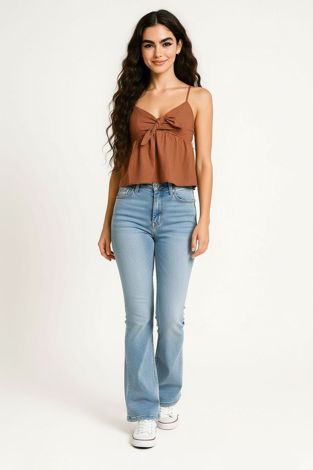 Blusa de tirantes delgados con escote en V y detalle de nudo frontal que aporta definición, corte imperio que brinda caída fluida, largo a la cadera con ajuste cómodo, confección en tejido ligero de tacto suave