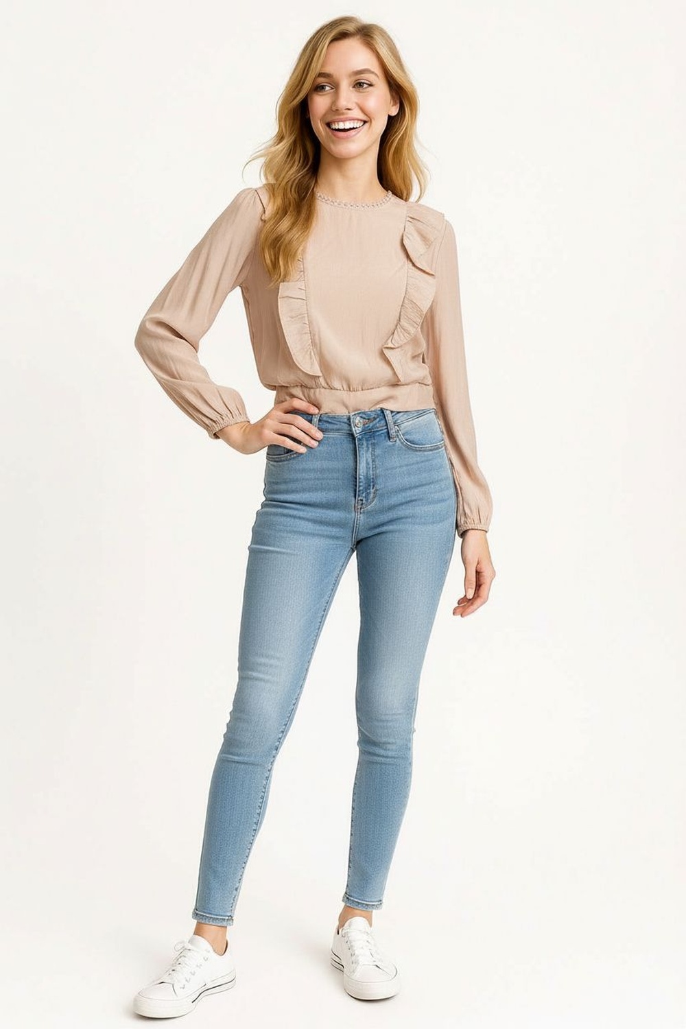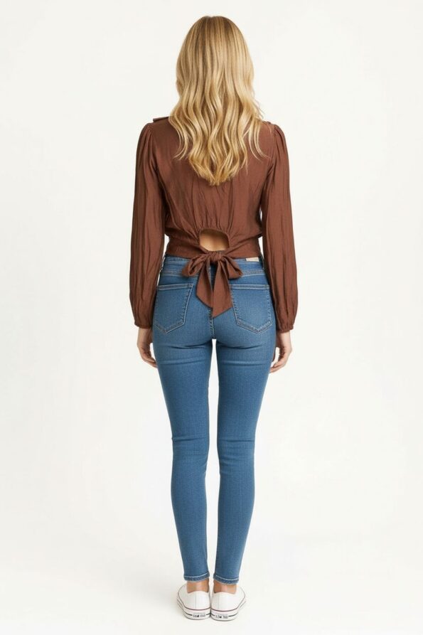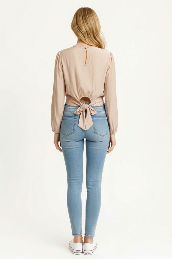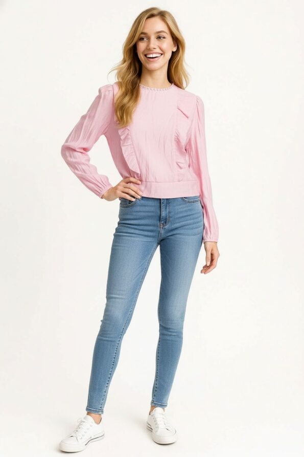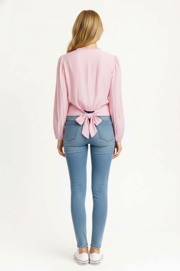 Blusa de manga larga con cuello redondo y detalle de pliegues frontales que aportan volumen y elegancia, confección en tejido ligero con textura suave al tacto, amarre posterior que permite ajustar la silueta y resalta el diseño femenino