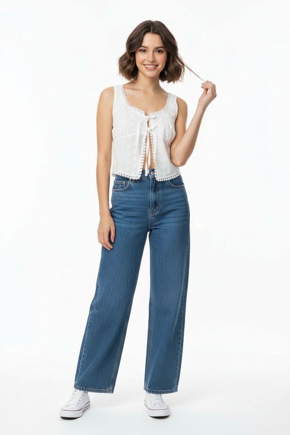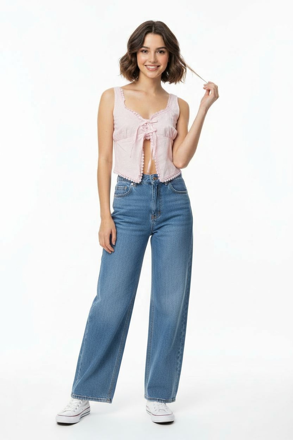 Top de tirantes con escote en v detalle de moño al frente textura ligera y terminado con encaje en bajo