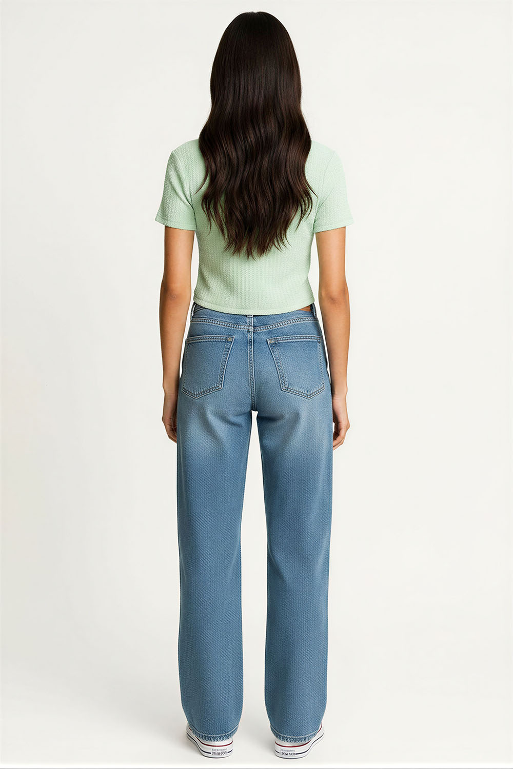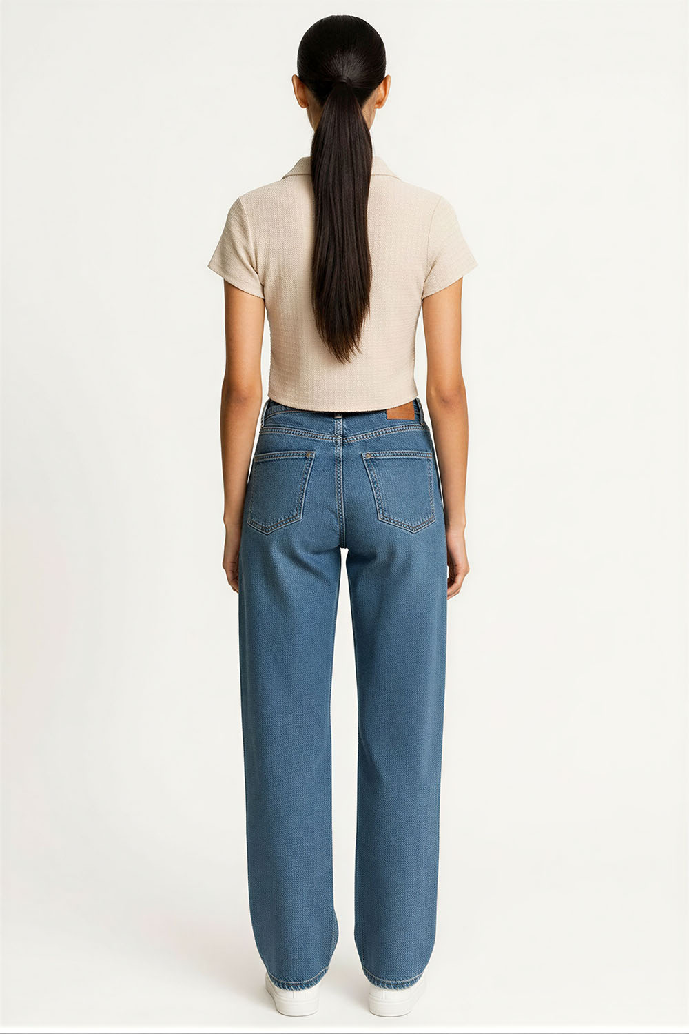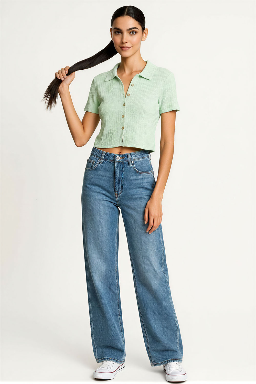 Blusa tipo crop con corte a la cintura que resalta la silueta, diseño con cuello camisero que aporta estructura, cierre frontal con botones funcionales que facilitan su uso, manga corta que brinda frescura, confección en tejido ligero con textura que agrega detalle visual y comodidad