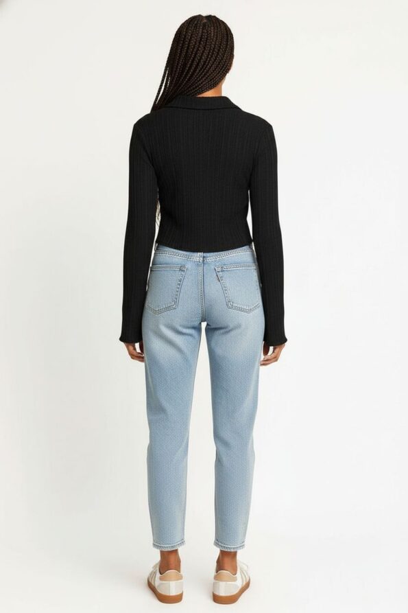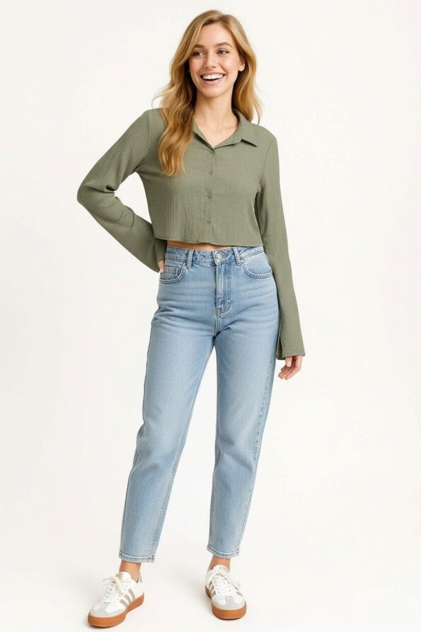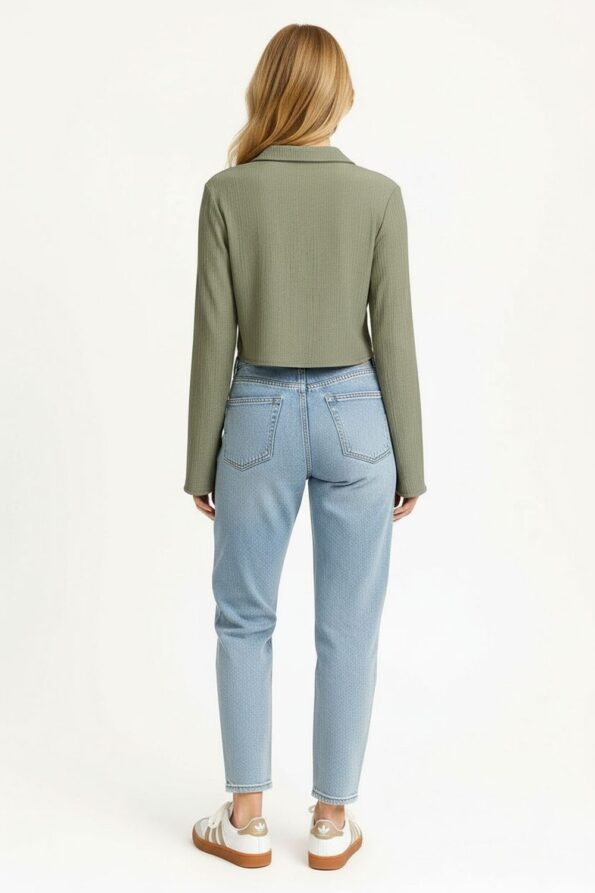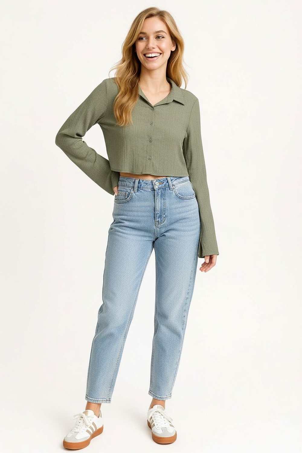 Blusa crop confeccionada en tejido con textura acanalada que brinda elasticidad y confort, cuello camisero con cierre de botones frontales que aporta un toque estructurado y moderno, mangas largas con acabado acampanado que estilizan el brazo y añaden movimiento, confección ligera que se adapta al cuerpo manteniendo un ajuste favorecedor