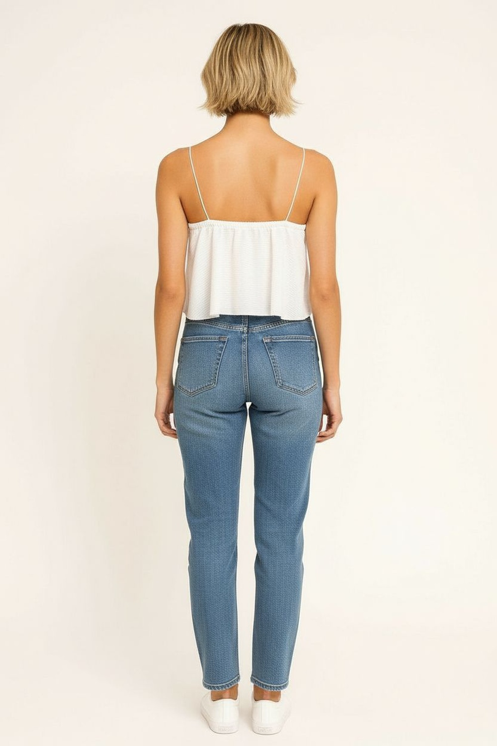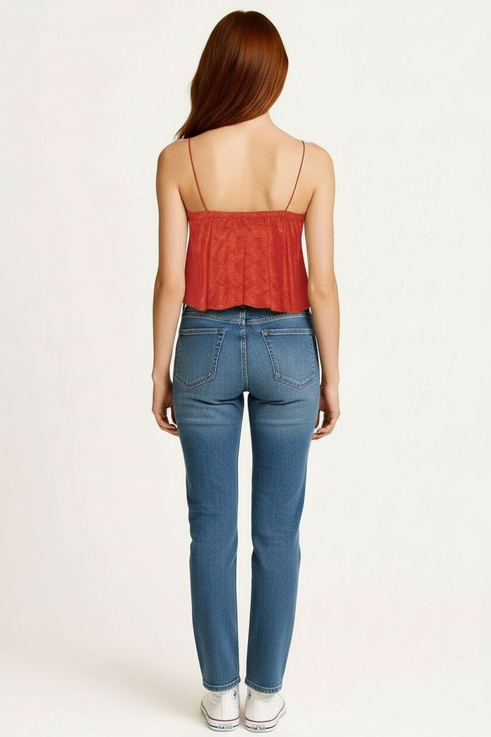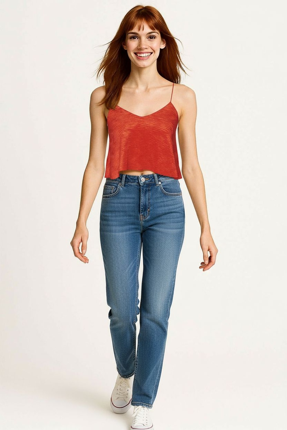 Blusa crop con tirantes delgados y escote en V pronunciado que estiliza el cuello, tejido texturizado con forro interno en zona frontal que brinda mayor seguridad, corte amplio con caída ligera y terminado ondulado en ruedo que aporta movimiento natural