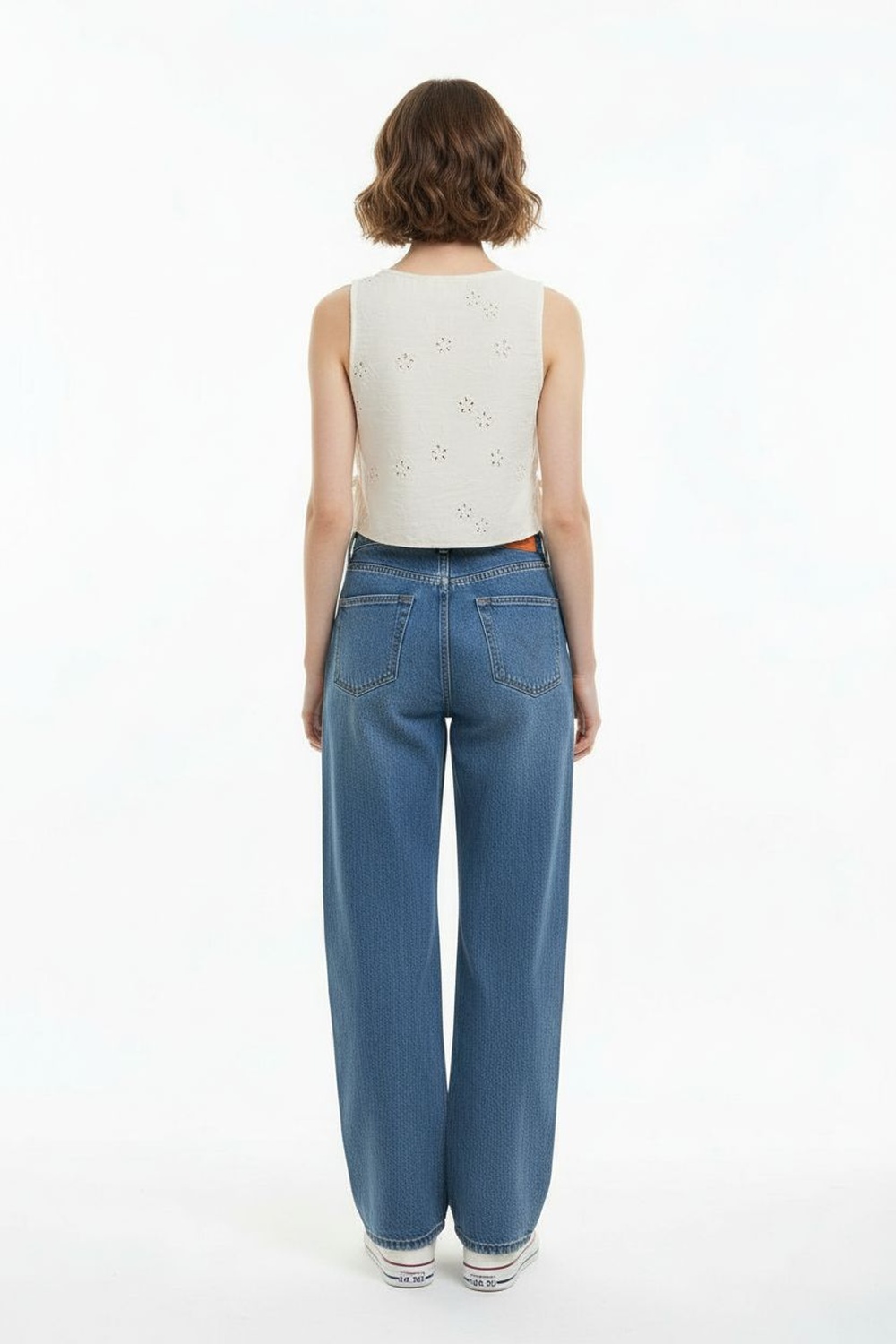 Jeans rígido de cinco bolsillos, tiro alto, corte amplio en pierna, pretina con cierre frontal, estructura firme, ajuste cómodo