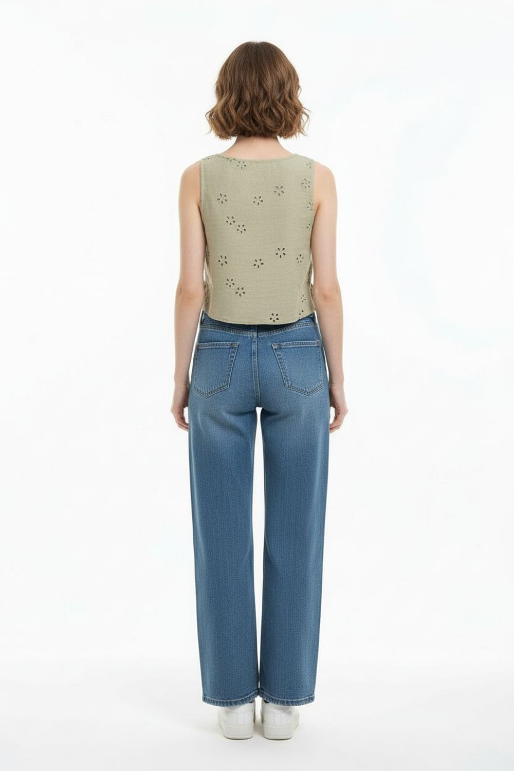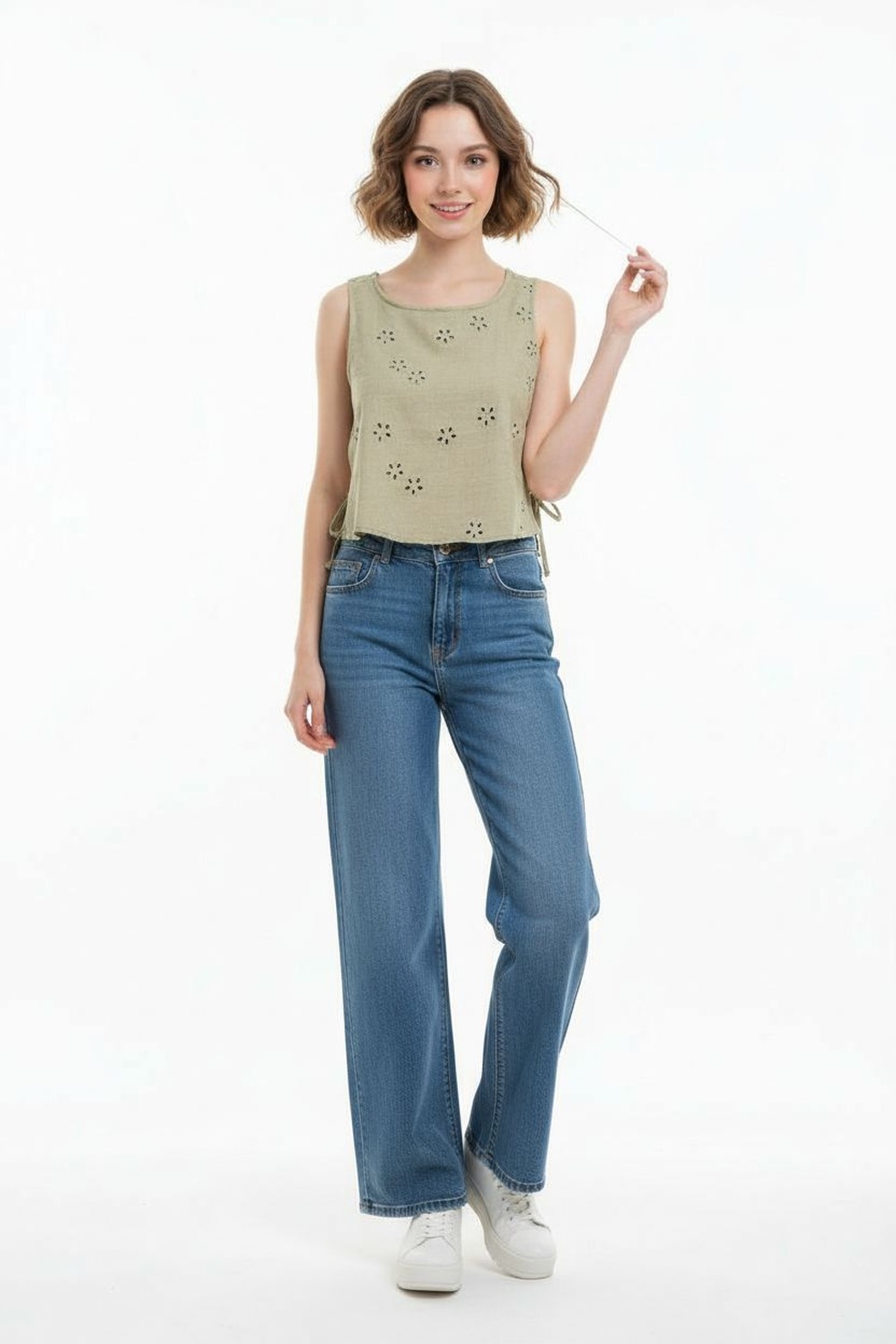 Blusa crop sin mangas con estructura ligera, diseño con amarres laterales ajustables, silueta recta, terminado delicado