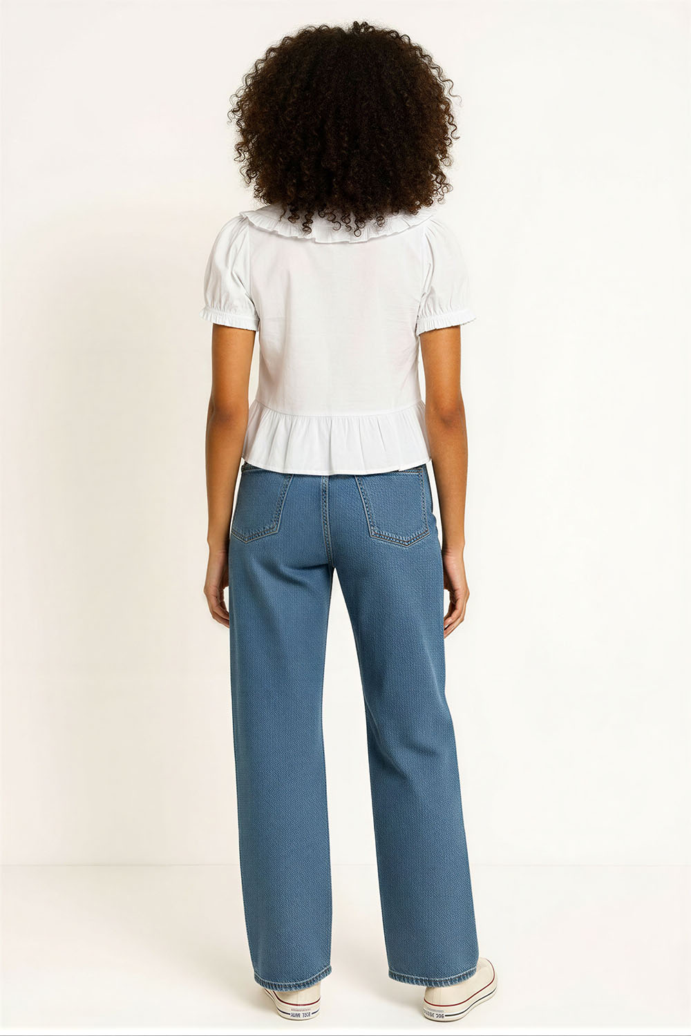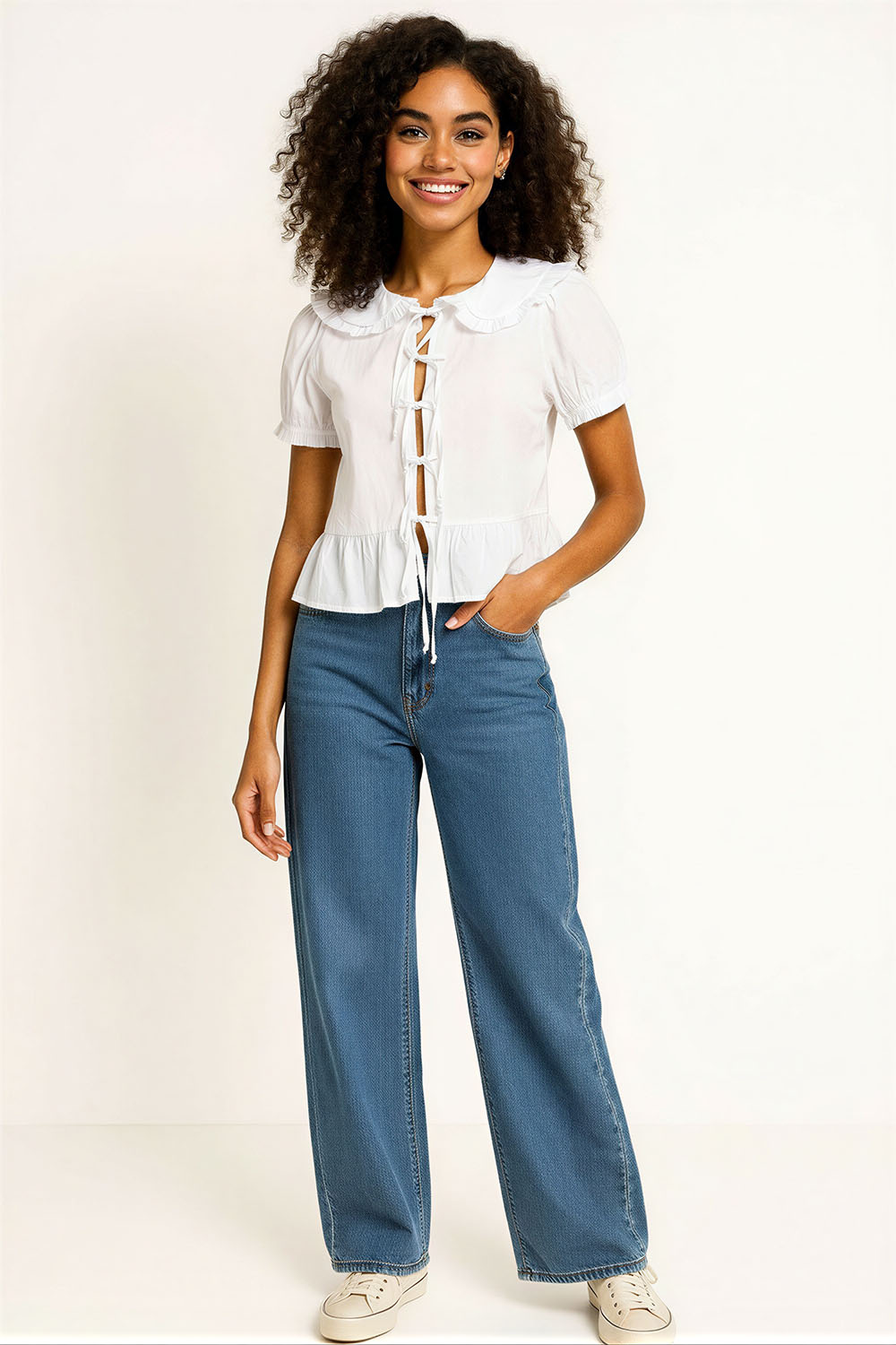 Blusa con cuello amplio tipo babero que aporta estructura y detalle, cierre frontal con amarres que permiten ajuste al cuerpo, manga corta con ligero volumen que brinda comodidad, corte a la cintura con faldón inferior que agrega movimiento, confección en tejido ligero que ofrece frescura al uso