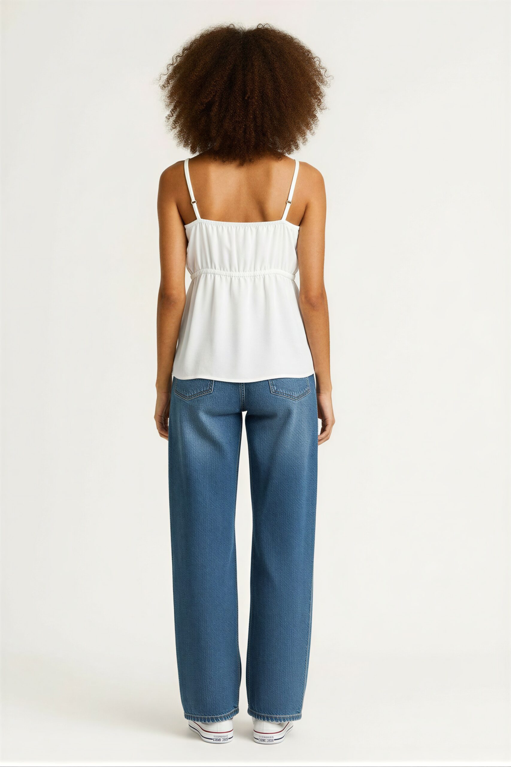 Blusa de tirantes delgados con escote recto, botonadura frontal funcional, ajuste mediante jareta en cintura que estiliza la silueta, corte suelto que brinda comodidad, confección ligera para uso continuo