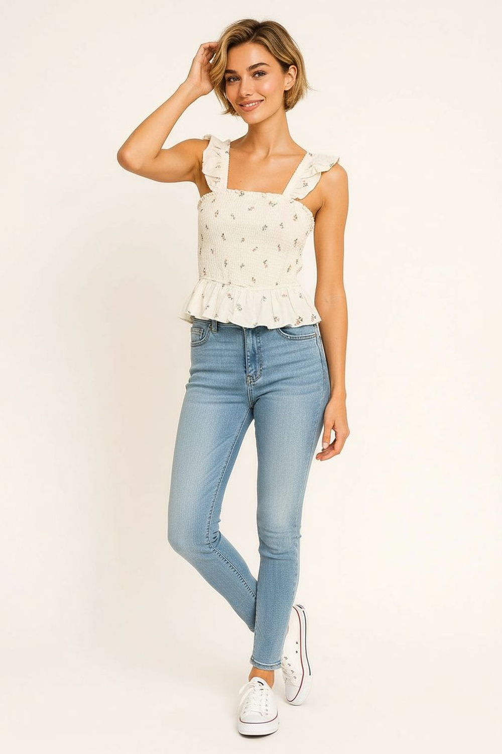 Blusa sin mangas con escote recto y tirantes anchos, cuerpo con smock elástico que brinda ajuste flexible y cómodo, terminación con volante inferior que aporta movimiento, confección en tejido ligero de tacto suave que ofrece frescura y confort prolongado