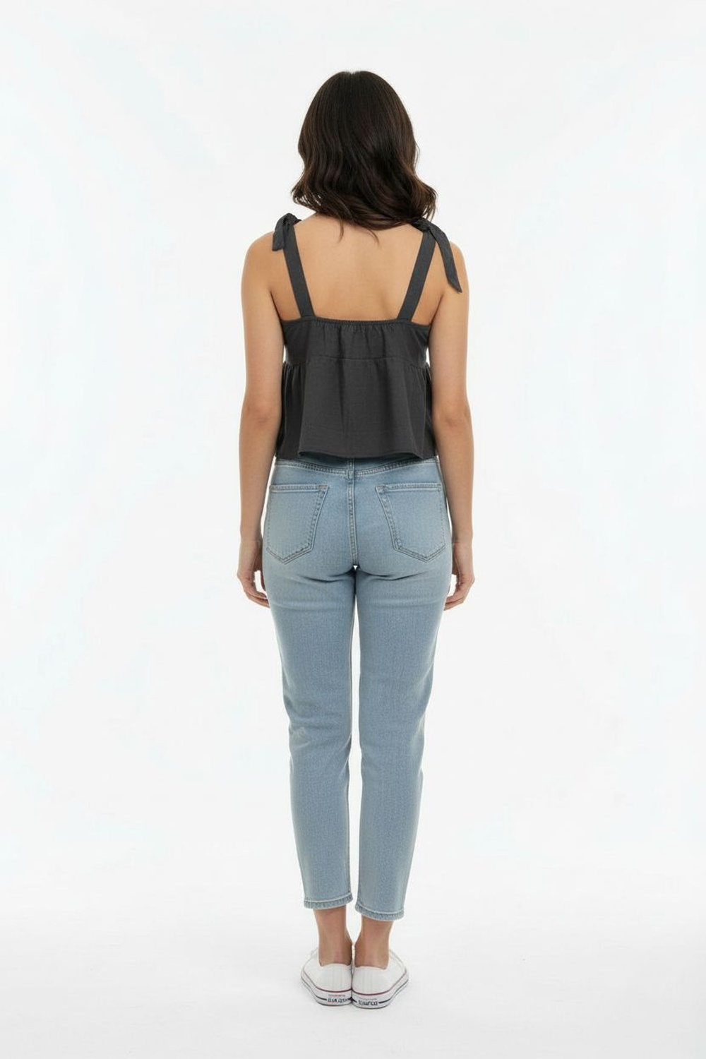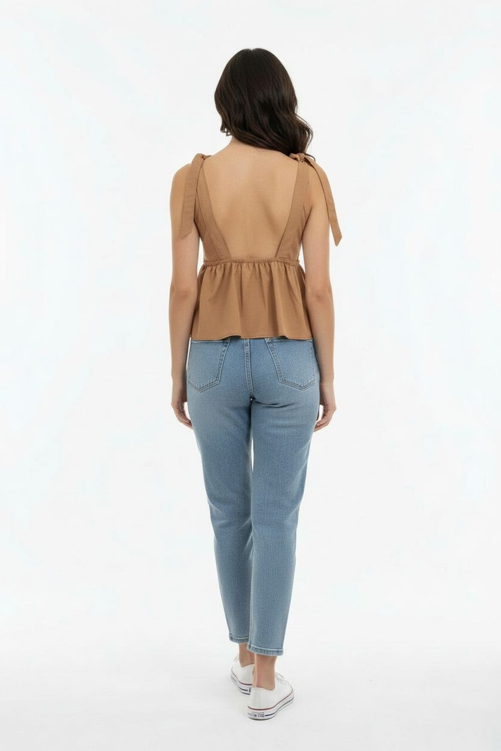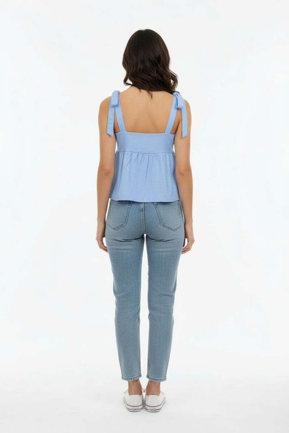 Blusa tipo halter con tirantes para amarre en hombros, escote cruzado, corte debajo del busto, caída ligera con volumen, estructura suave y ajuste cómodo