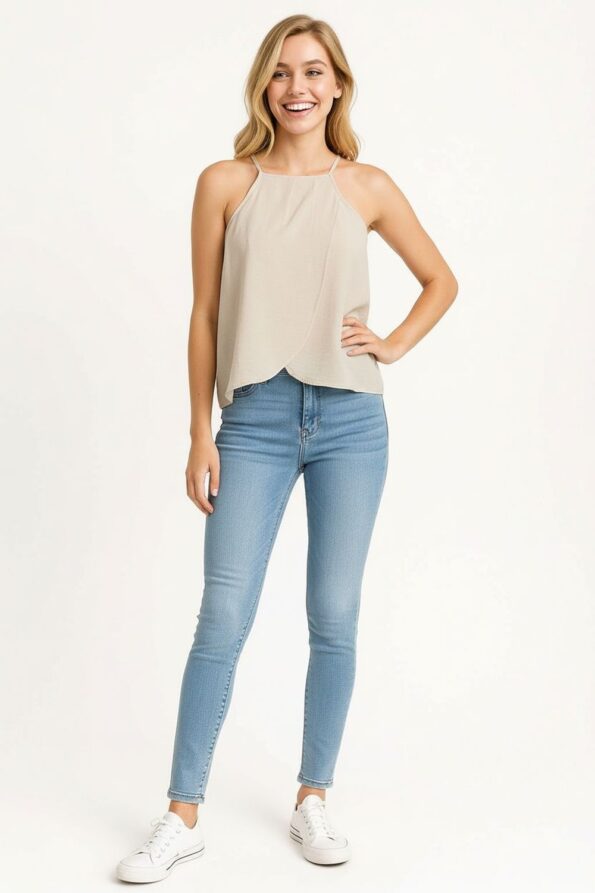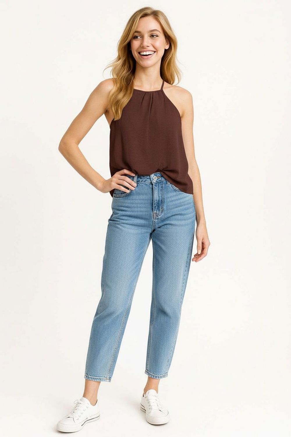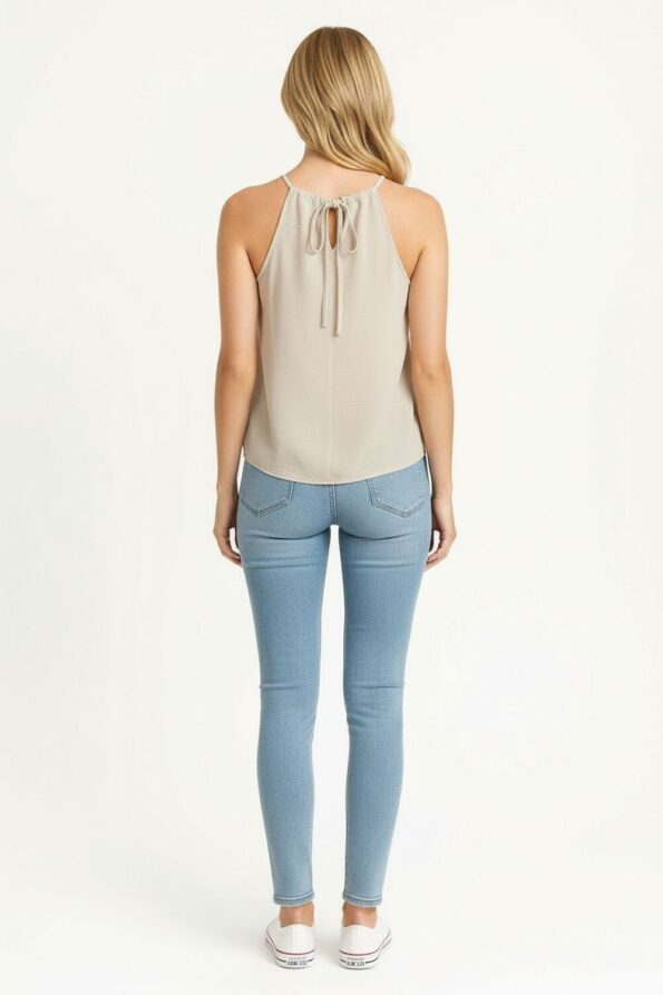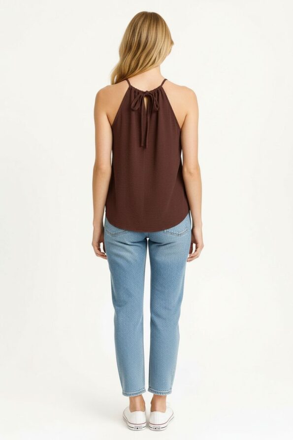 Blusa con escote halter que estiliza los hombros y cuello, amarre posterior con lazo que permite un ajuste personalizado, diseño superpuesto al frente que aporta fluidez y movimiento, confeccionada en tejido ligero de textura suave que ofrece frescura y comodidad, ideal para looks casuales con toque moderno