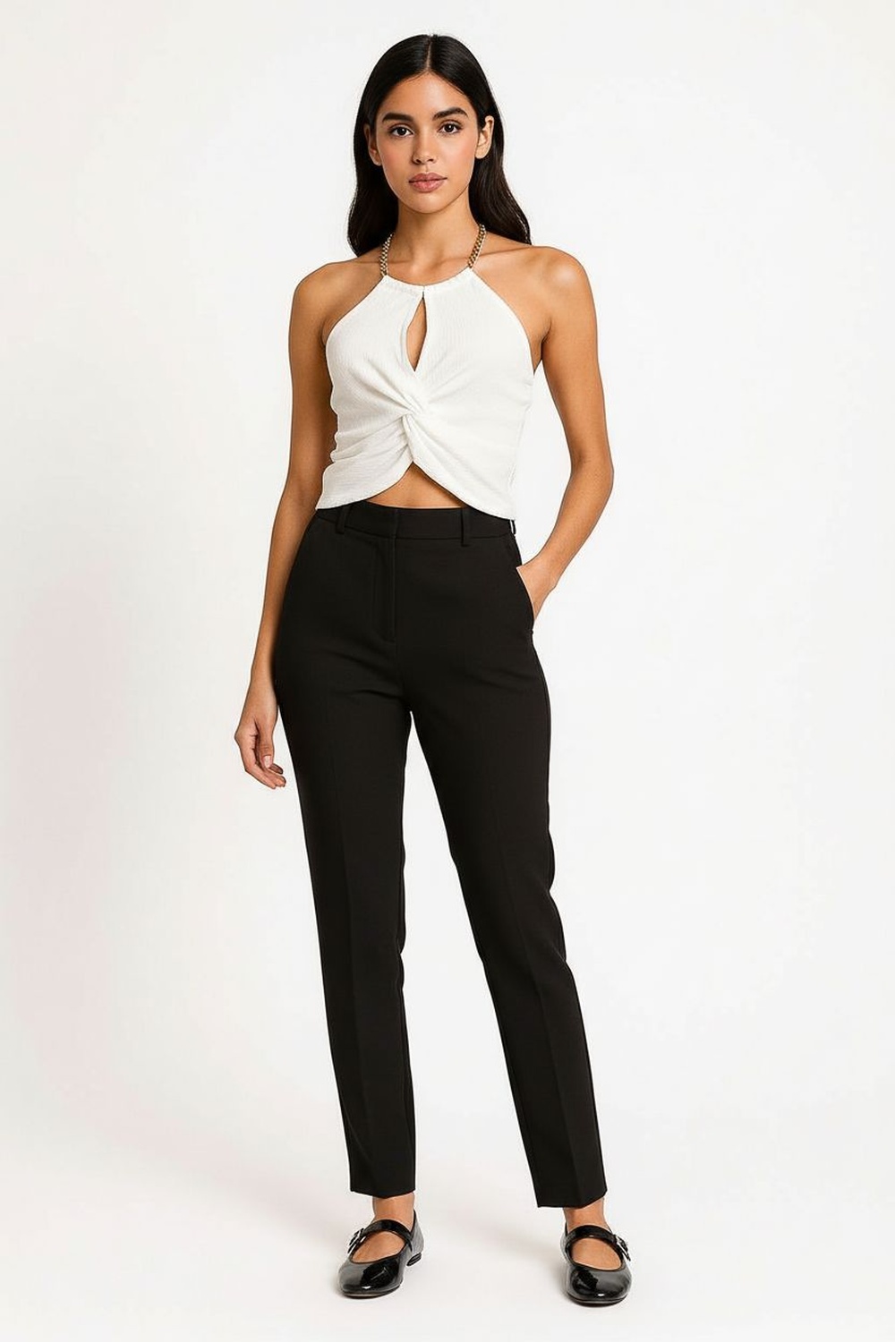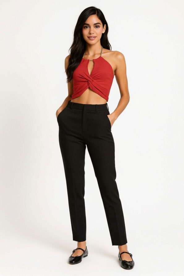 Blusa de corte halter con tirantes de cadena metálica que aportan un detalle sofisticado, escote con abertura frontal que realza el diseño, cruce central drapeado que estiliza la silueta y añade movimiento, confección en tejido crepón que brinda frescura y un acabado elegante, ideal para looks de noche y combinaciones modernas de temporada