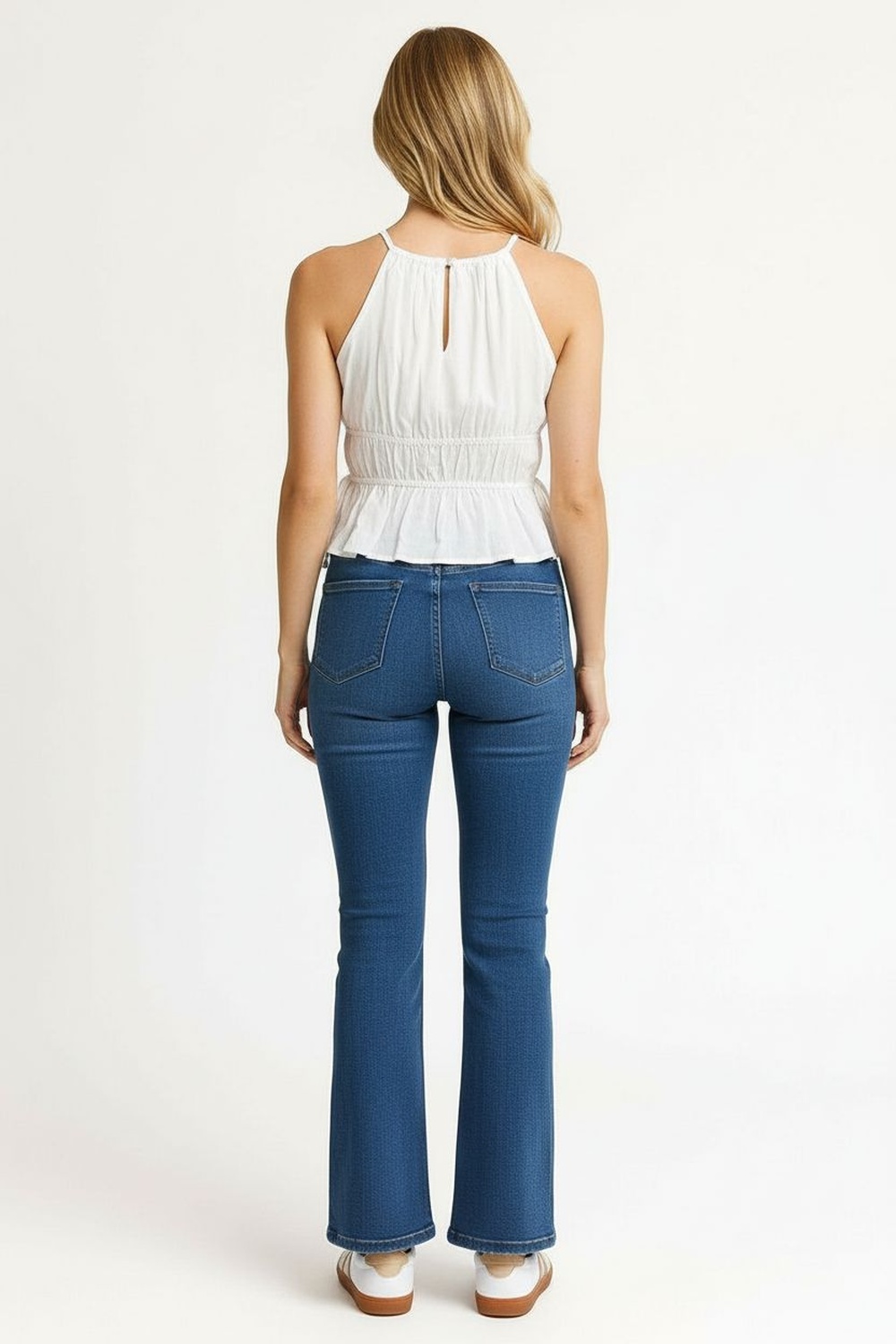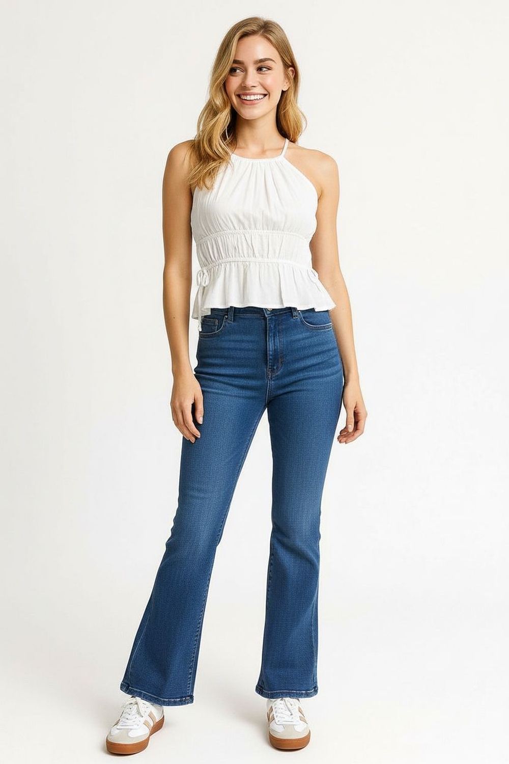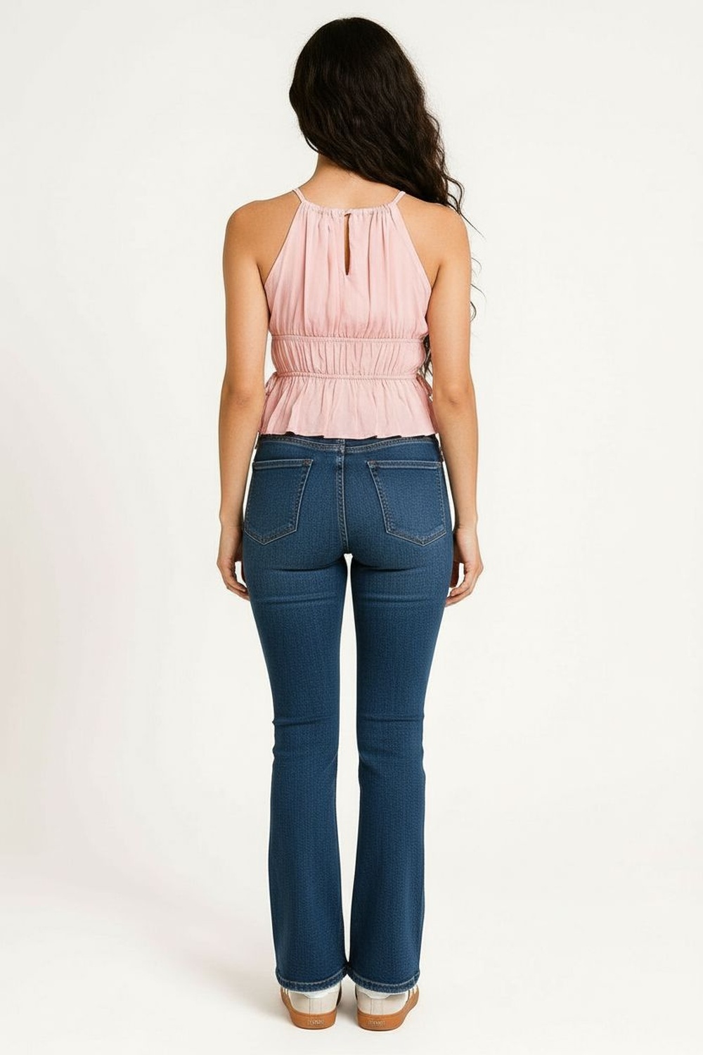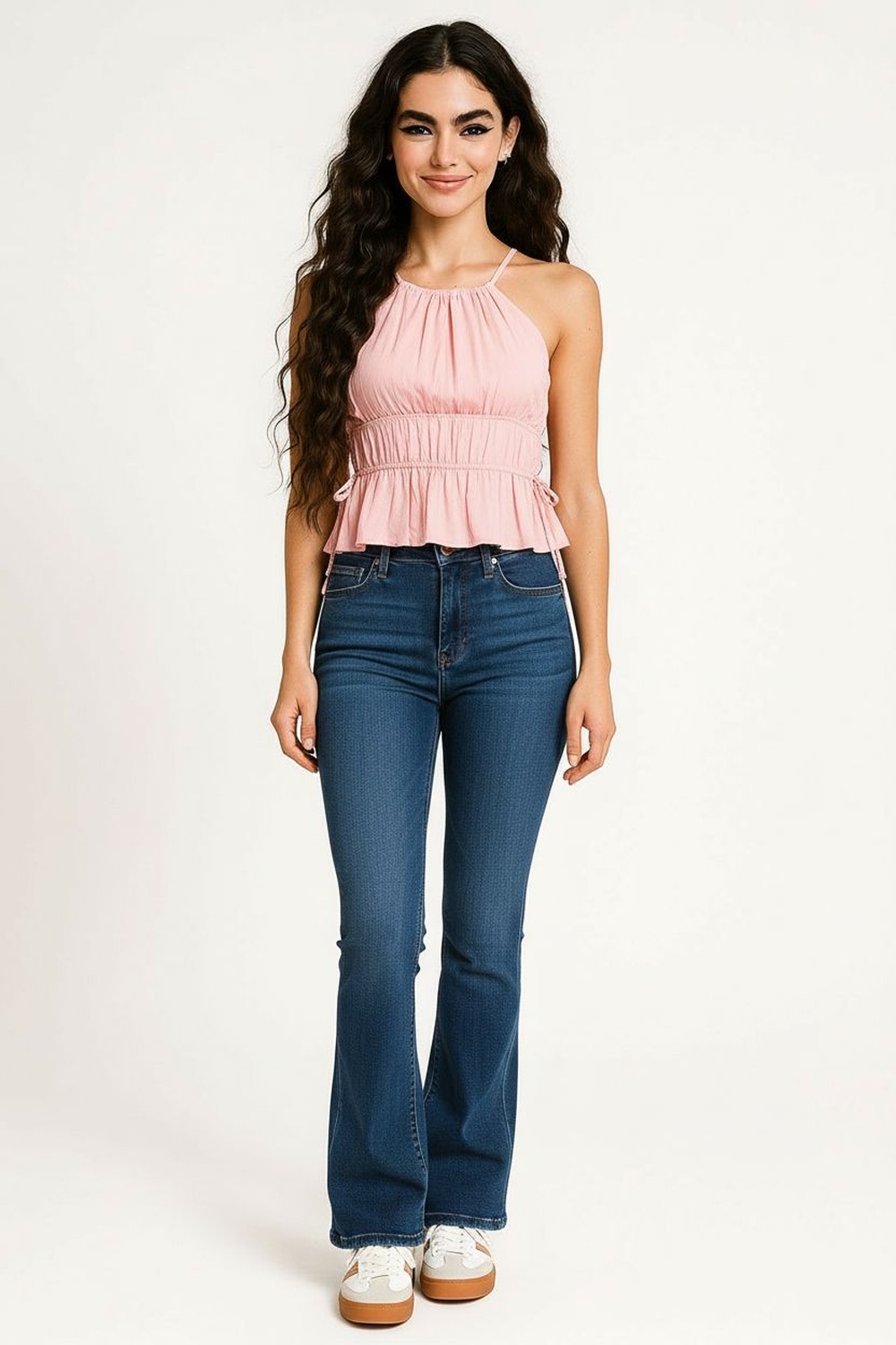 Blusa de corte halter con escote cerrado y caída suave, confección en tejido ligero con plisado fino que aporta textura, cintura con ajuste smock que define la silueta, largo regular con ligero vuelo en el bajo, tirantes delgados integrados al diseño