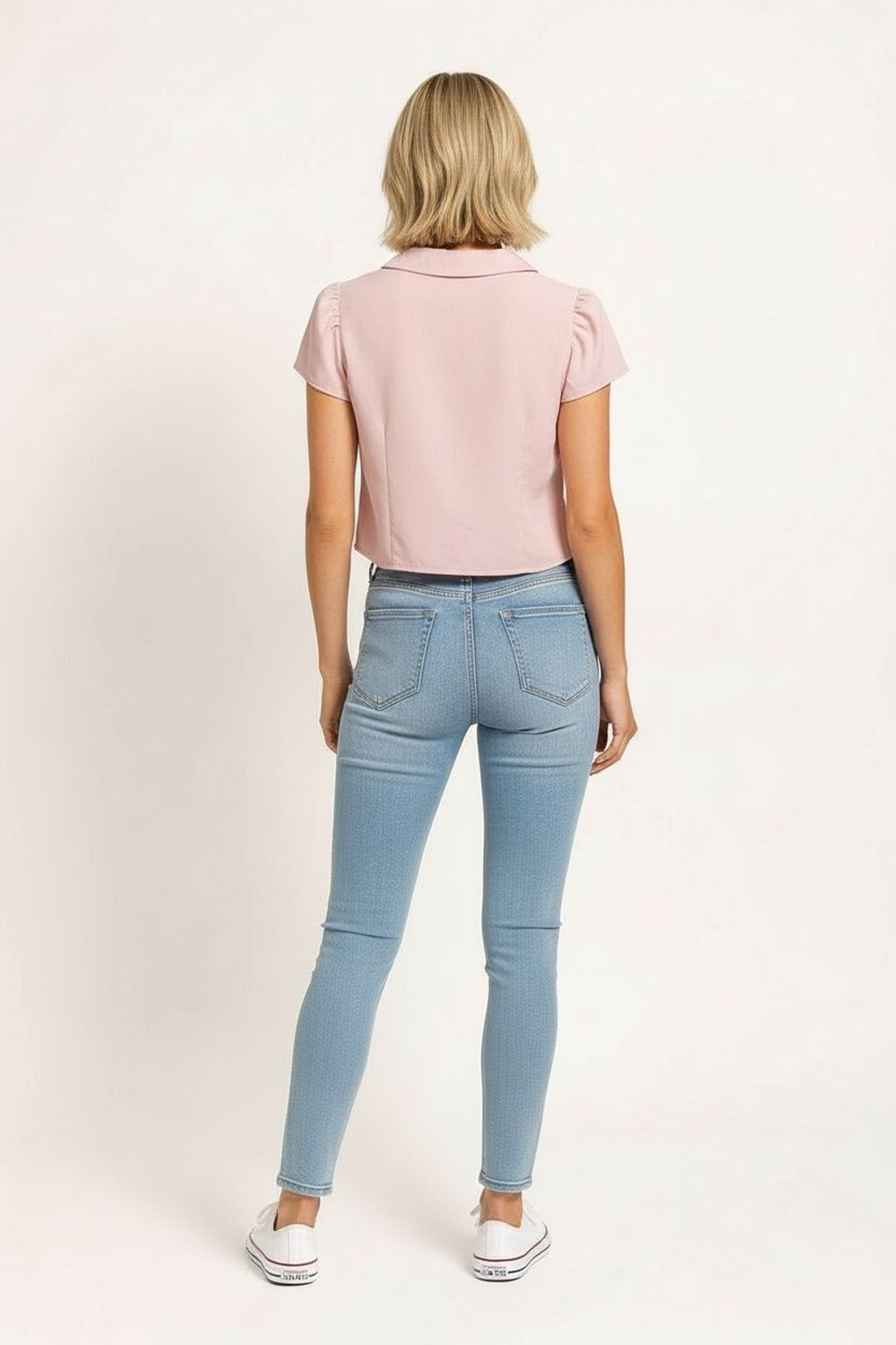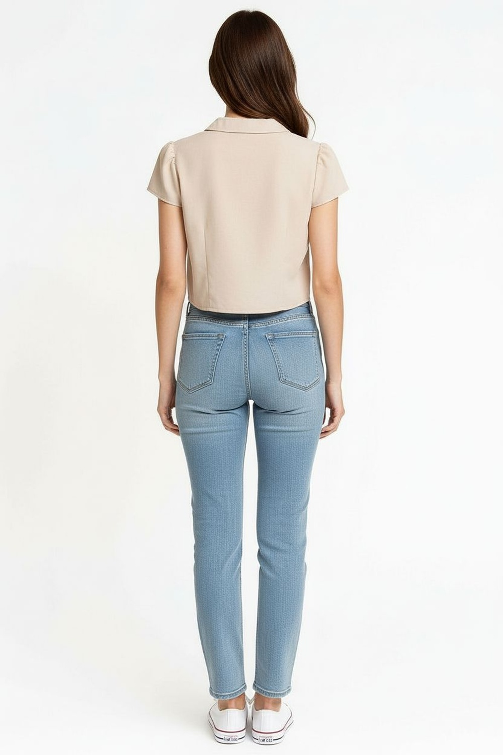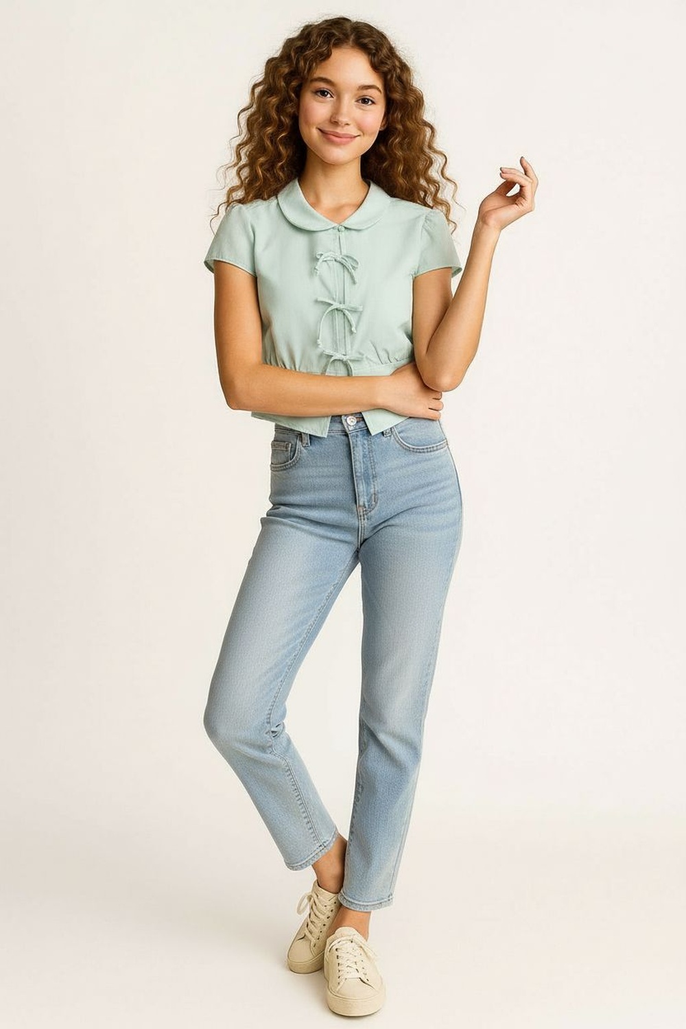 Blusa de lino con cuello camisero redondeado que suaviza la línea del escote, manga corta con ligero volumen en hombros, diseño frontal con amarres decorativos que permiten ajuste personalizado, corte a la cintura que define la figura, confección ligera que brinda frescura y comodidad prolongada