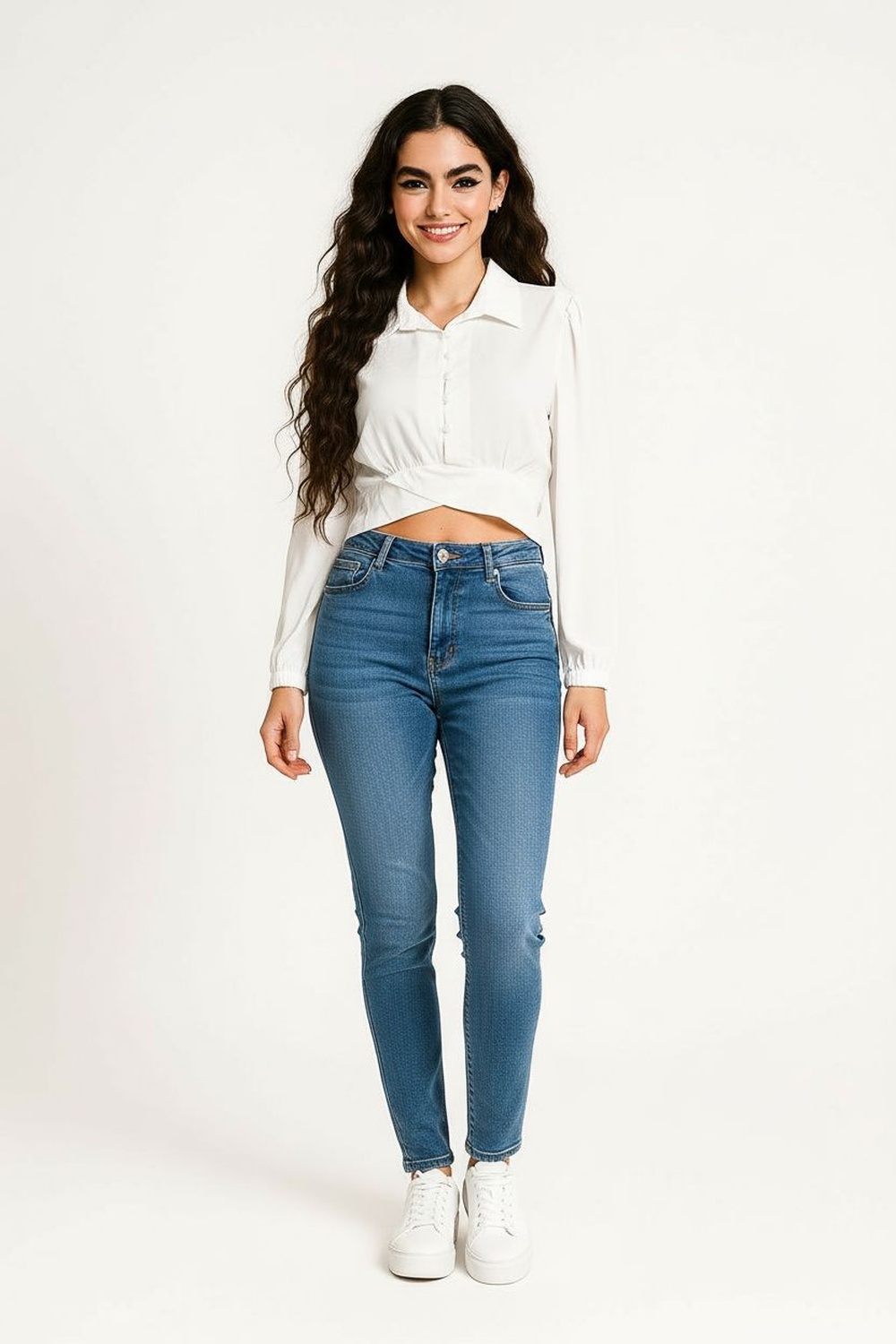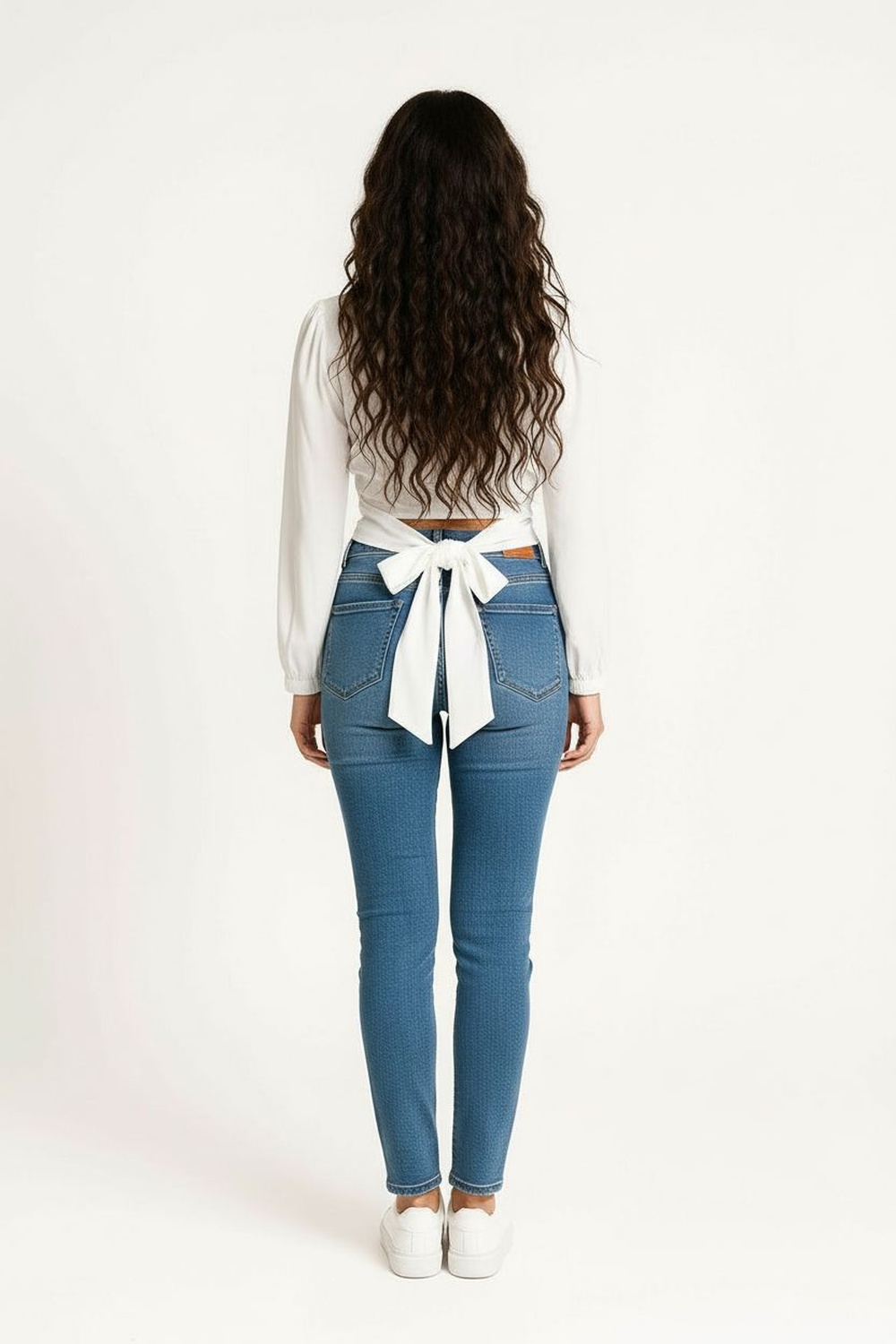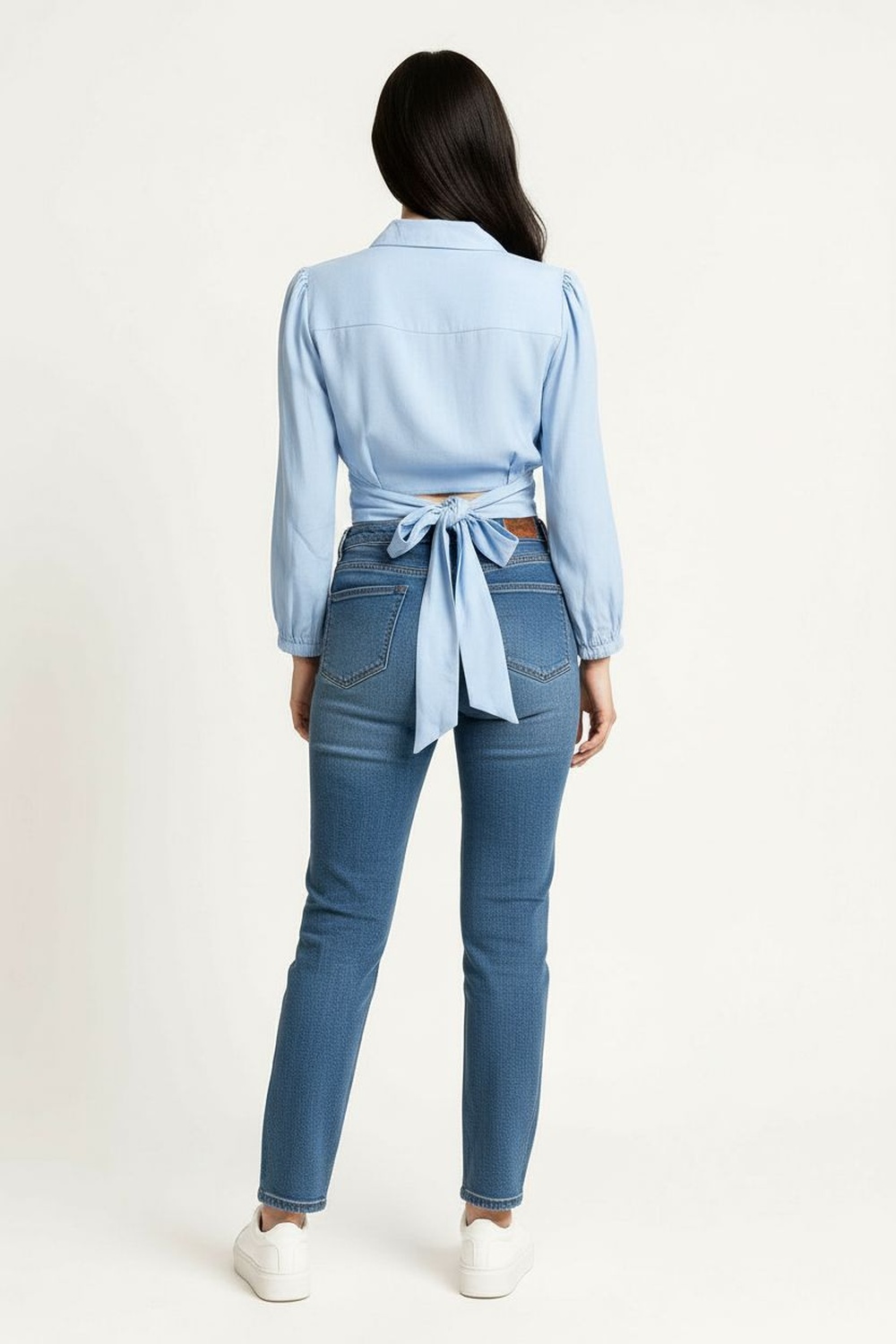 Blusa manga larga con cuello camisero, botonadura frontal parcial, corte corto, amarre posterior ajustable, puños elásticos, confección ligera