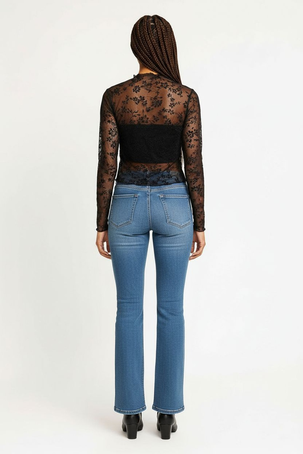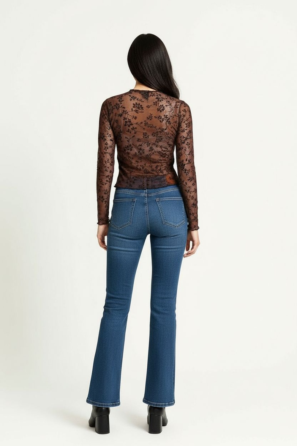 Blusa de malla con textura suave y diseño de flores en relieve, cuello redondo con terminación limpia, manga larga ajustada y dobladillo con efecto ondulado que añade movimiento, confeccionada con materiales ligeros que aportan frescura y un toque femenino