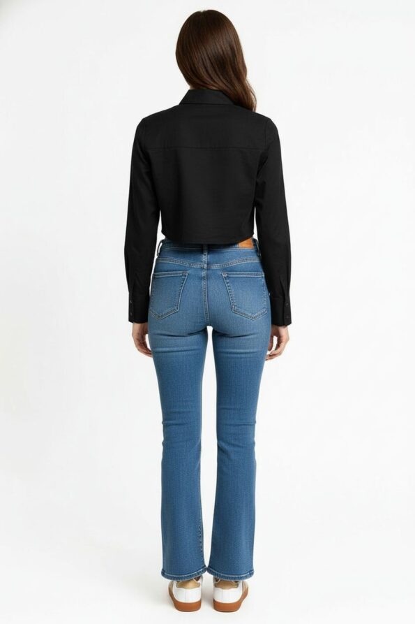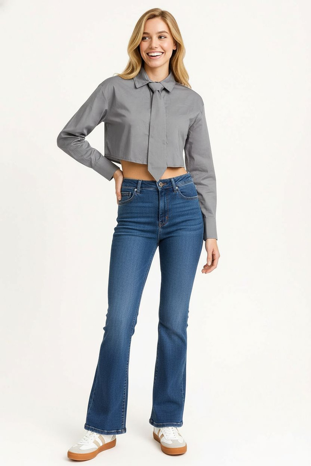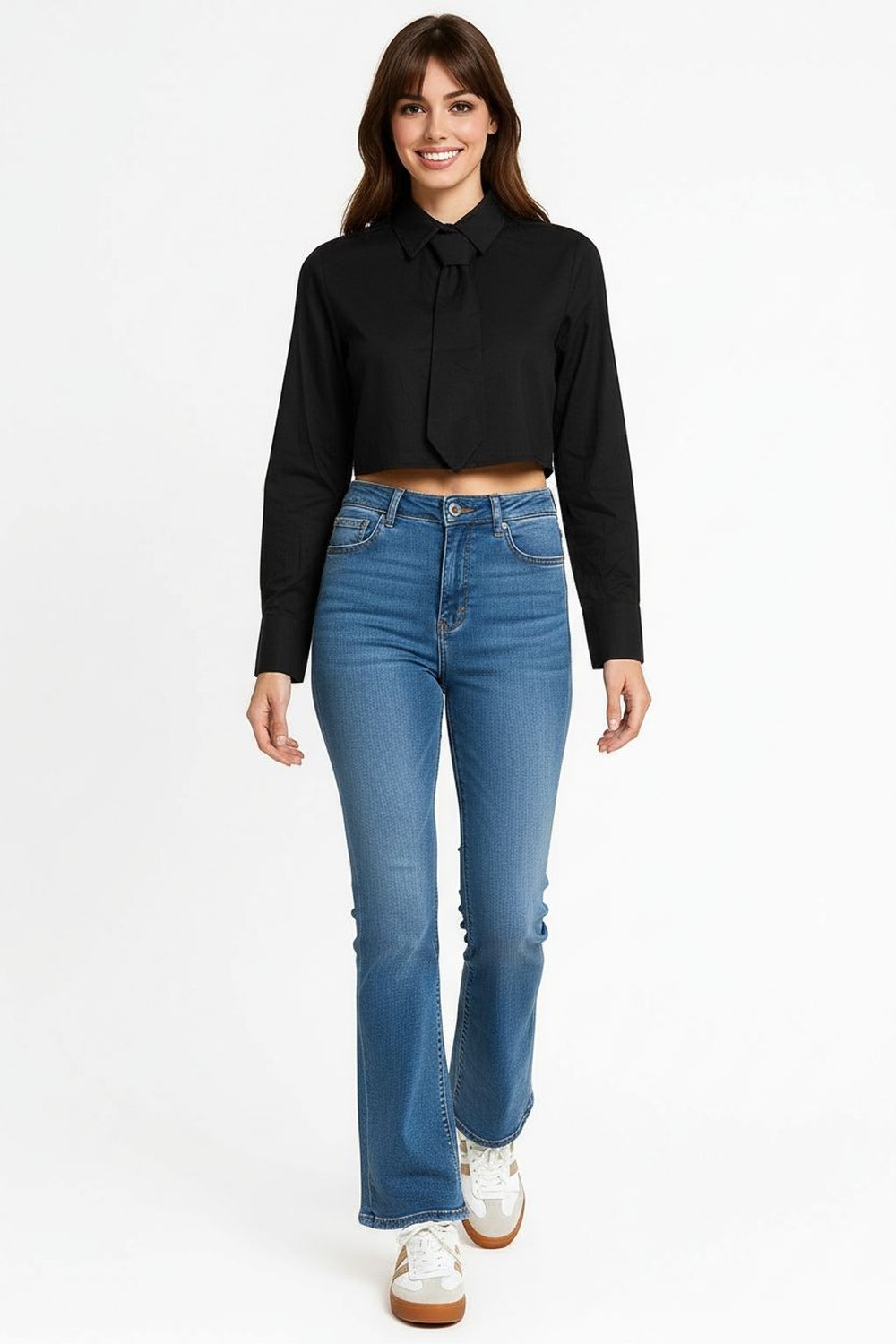 Blusa camisera de manga larga confeccionada en manta ligera con cuello clásico y botonadura oculta al frente, diseño crop con dobladillo posterior enresortado que aporta ajuste cómodo y moderno, puños con botón que brindan acabado pulido y costuras finas que aseguran durabilidad