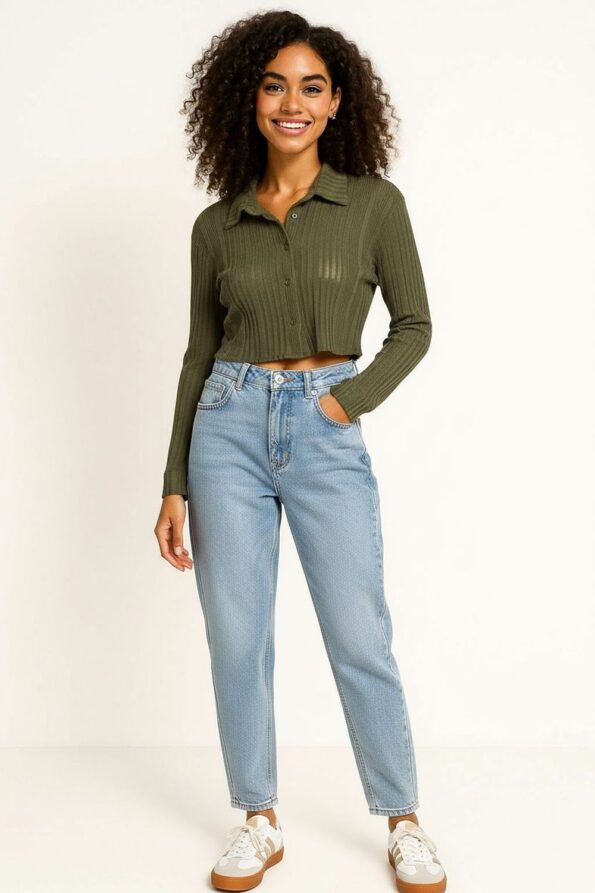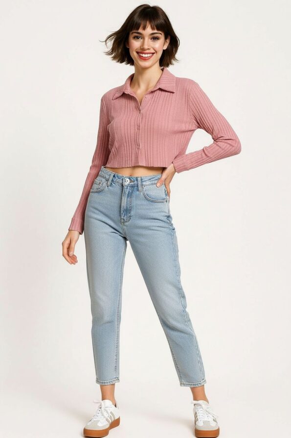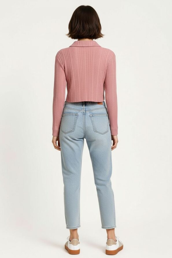 Blusa de manga larga con corte camisero que aporta un estilo moderno y casual, confeccionada en tela rib hacchi que brinda textura y comodidad, cuello camisero clásico que realza un acabado elegante, botones frontales funcionales que permiten ajustar la apertura, dobladillo recto que asegura la estructura de la prenda y costuras reforzadas que ofrecen durabilidad en cada uso