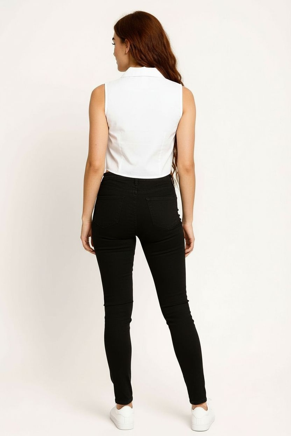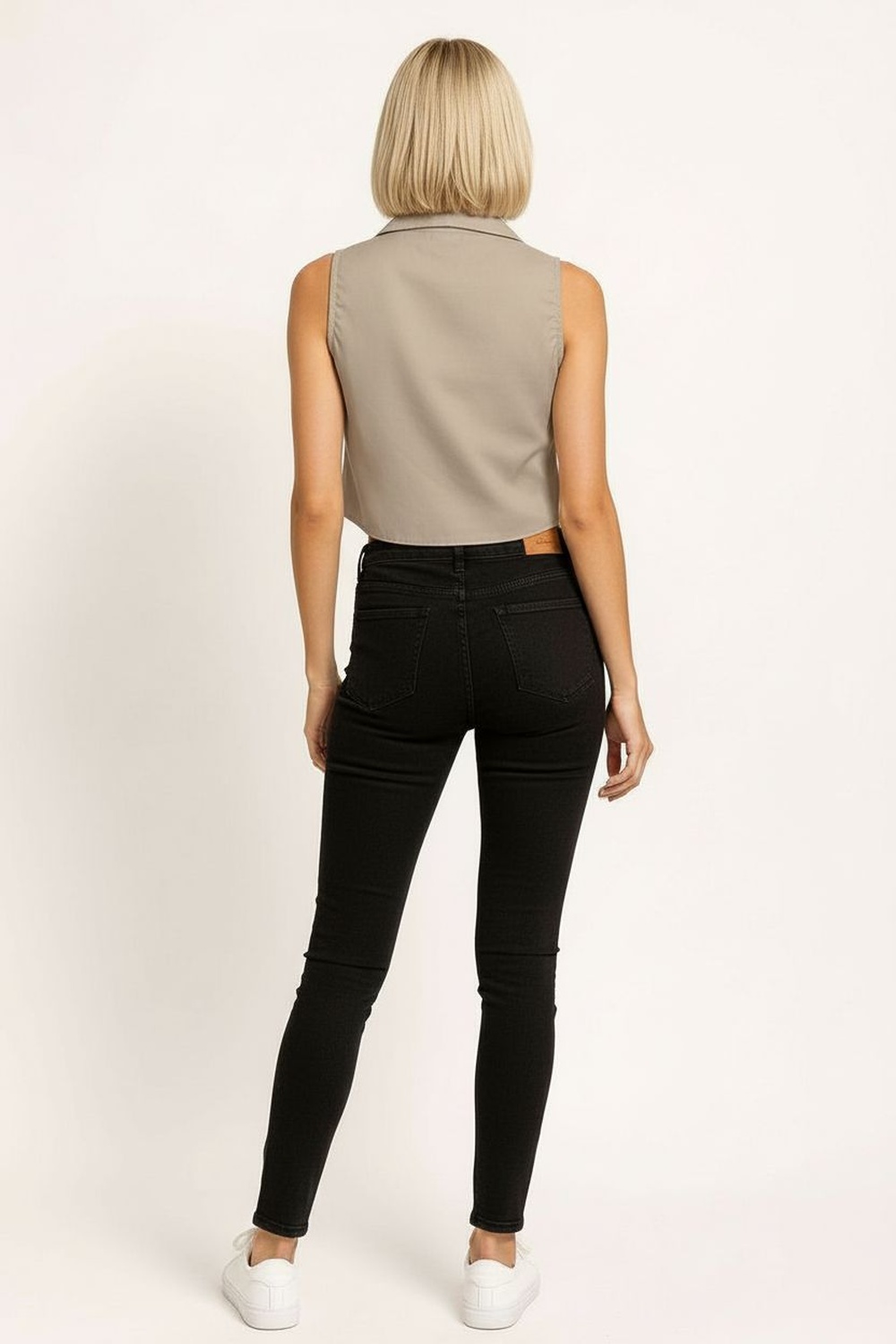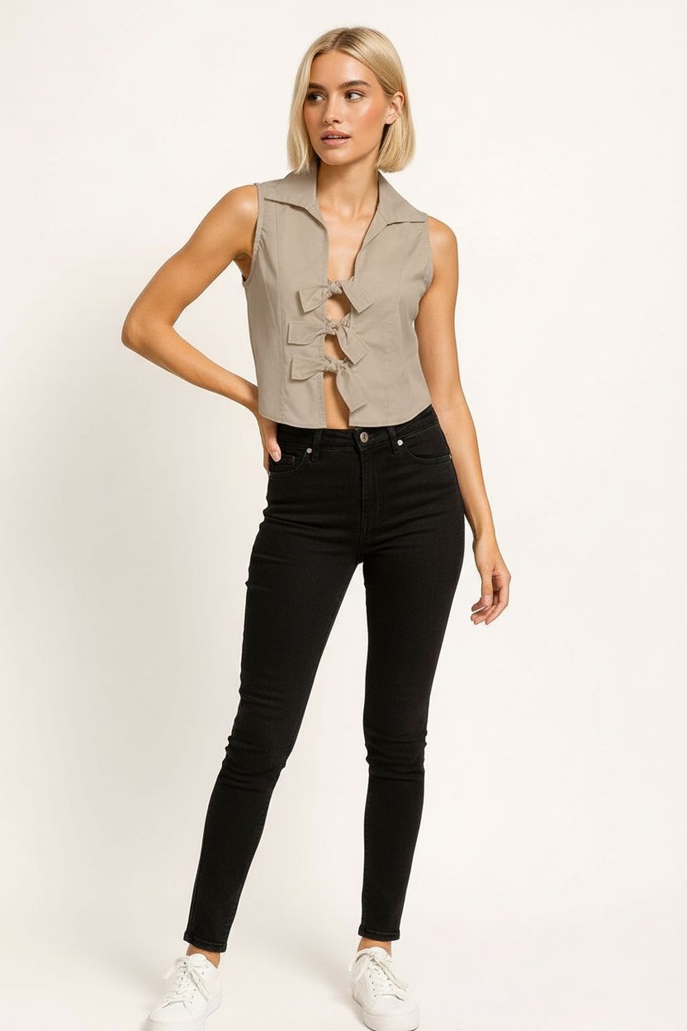 Blusa sin mangas con cuello camisero y escote en V, diseño frontal con amarres funcionales que permiten ajuste gradual, largo a la cintura, confección en tejido ligero de caída suave, terminados limpios en sisas y cuello