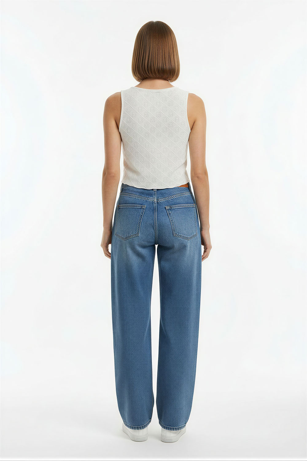 Blusa sin mangas con escote redondo que brinda comodidad, diseño con abertura frontal y amarres que permiten ajuste personalizado, corte corto que estiliza la figura, terminación inferior con ligero ondulado que aporta detalle, confección en tela ligera con textura que brinda frescura