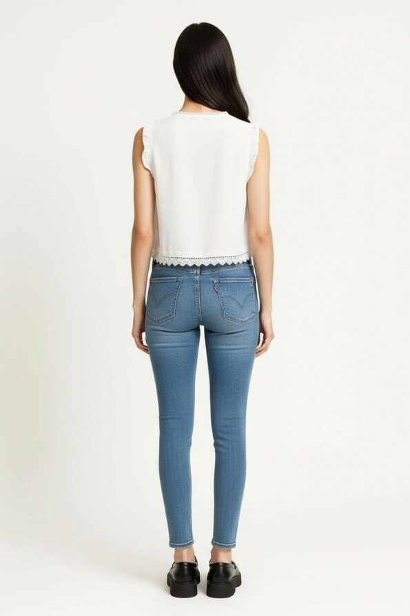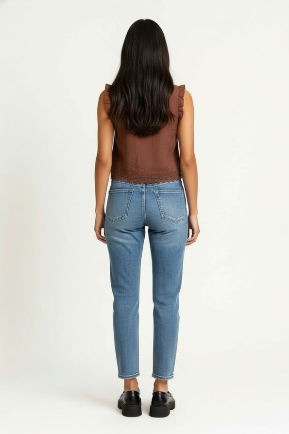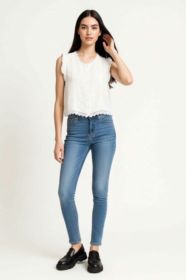 Blusa sin mangas de corte recto con aplicaciones de encaje decorativo en delantero, detalle de volantes en hombros que aportan un toque femenino, cuello redondo con botonadura frontal para un ajuste práctico, terminación en dobladillo con encaje que realza el diseño y textura ligera que ofrece frescura y comodidad durante el día