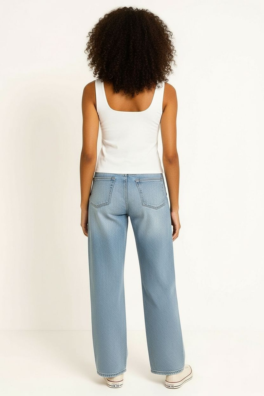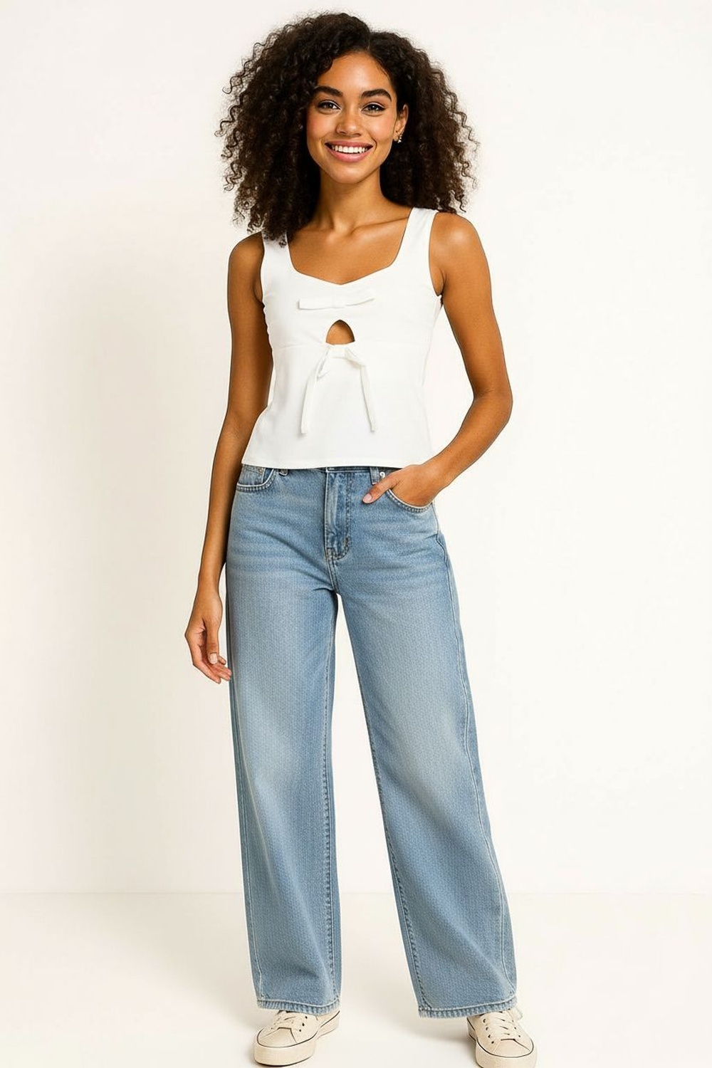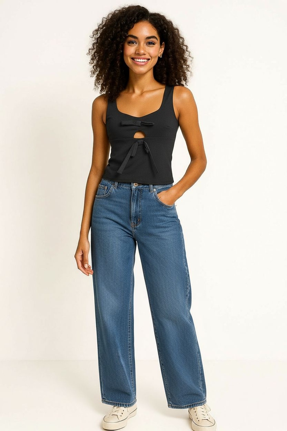 Blusa sin mangas con escote recto, detalle frontal con lazo y abertura, ajuste al cuerpo con caída ligera, confección suave de uso cómodo
