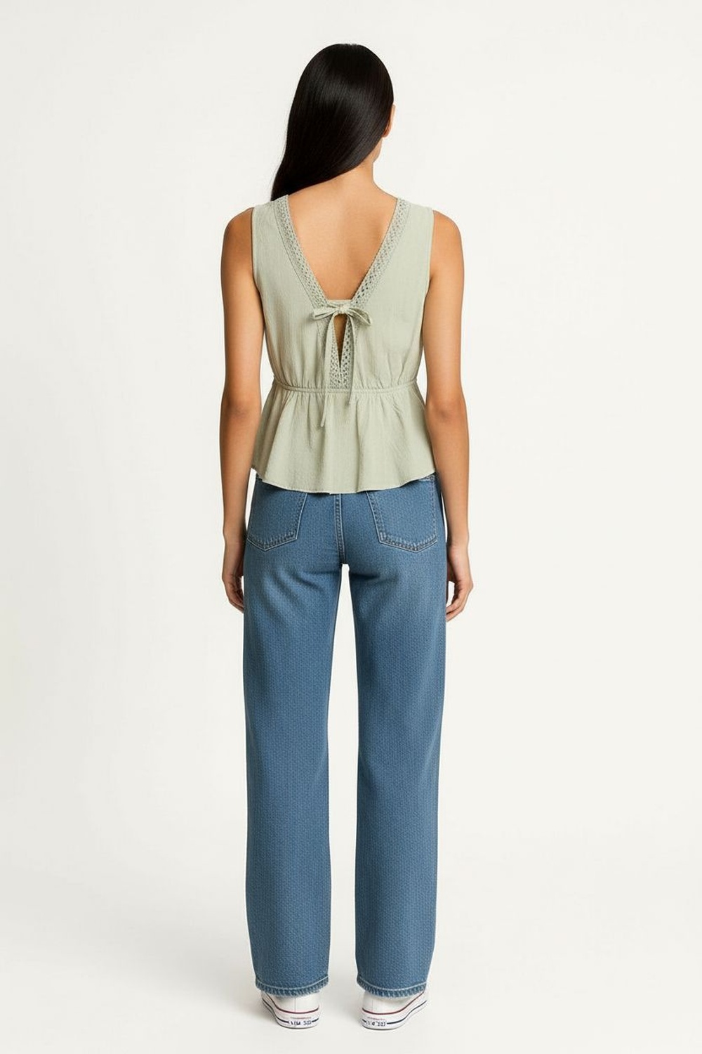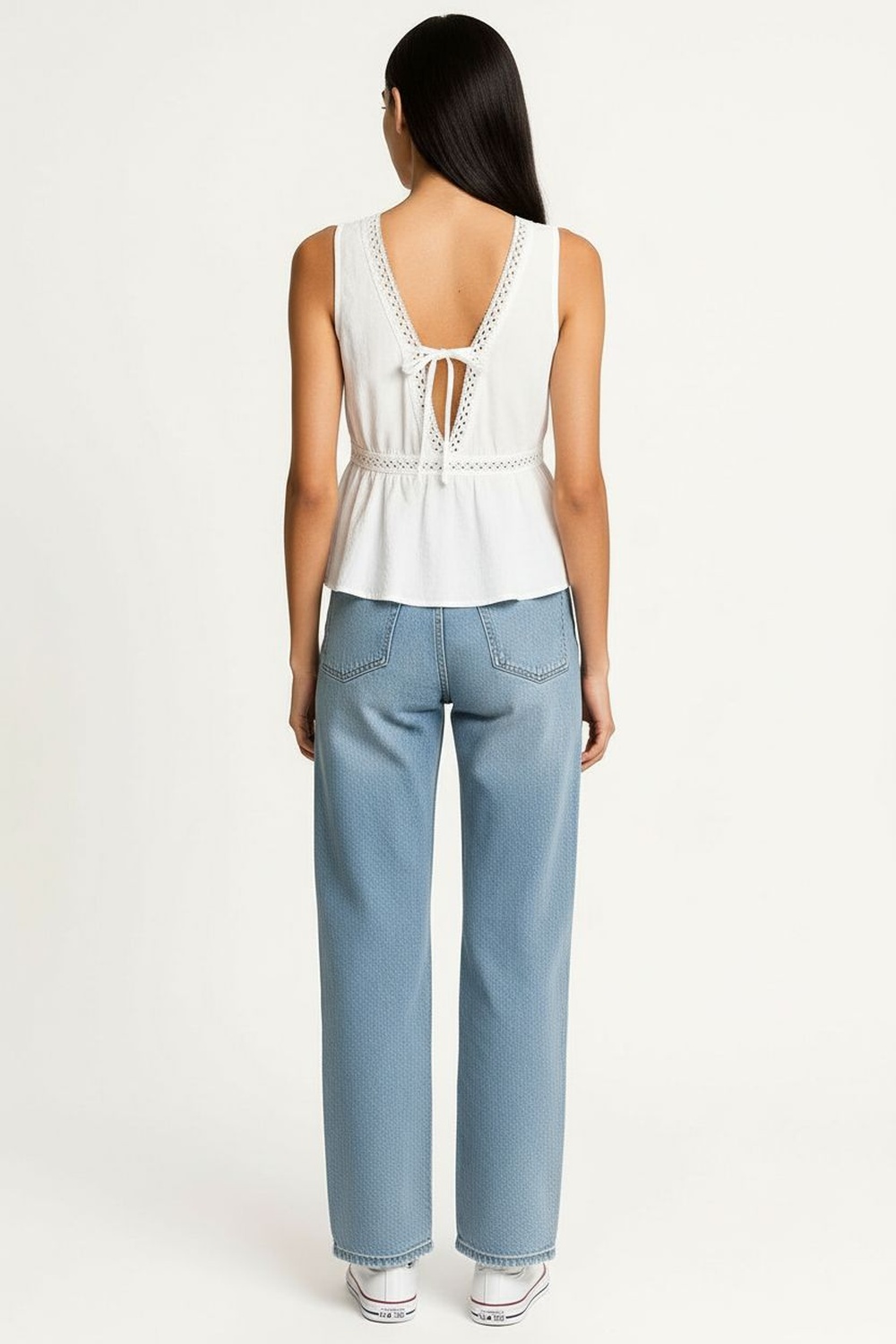 Blusa sin mangas con escote profundo al frente, detalle de encaje en contorno, pretina bajo busto, panel inferior con vuelo, espalda con lazo ajustable