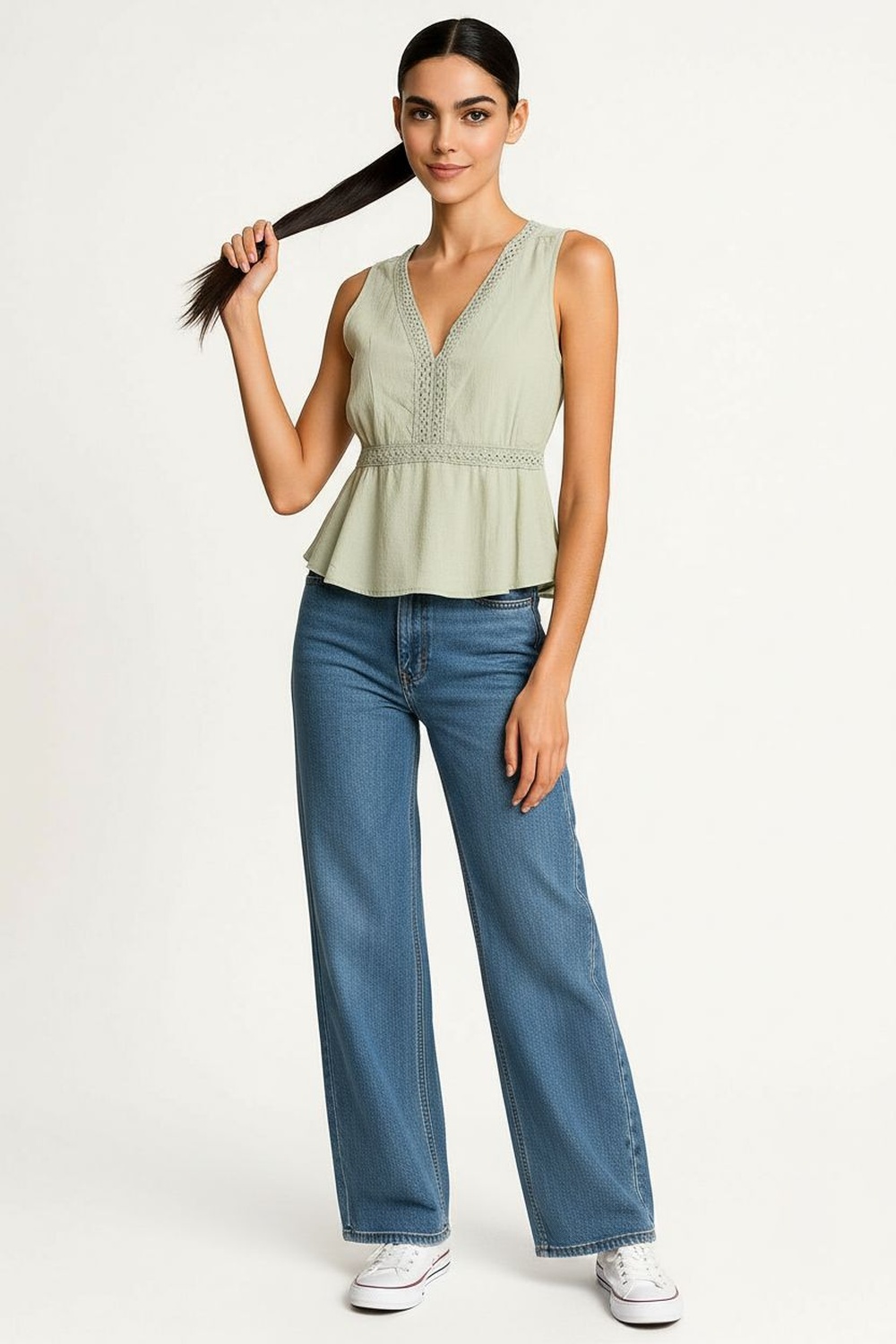 Jeans de tiro alto con pretina y bot贸n, bolsillos funcionales, corte recto amplio, largo completo, estructura r铆gida, ajuste c贸modo