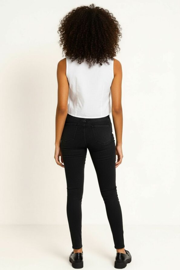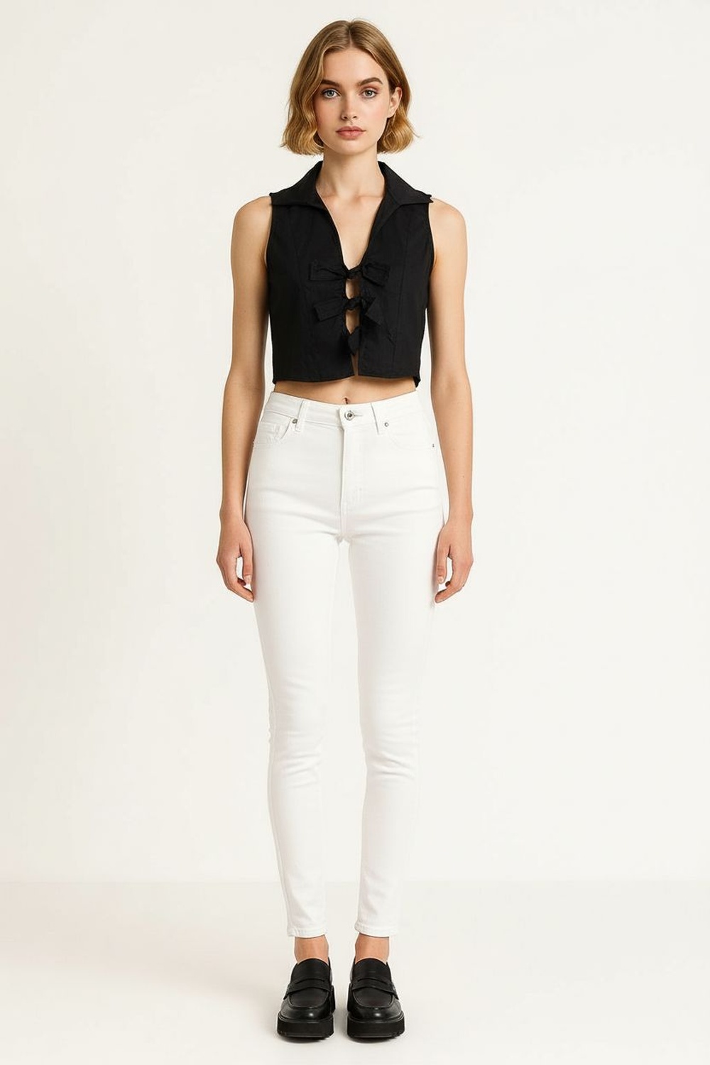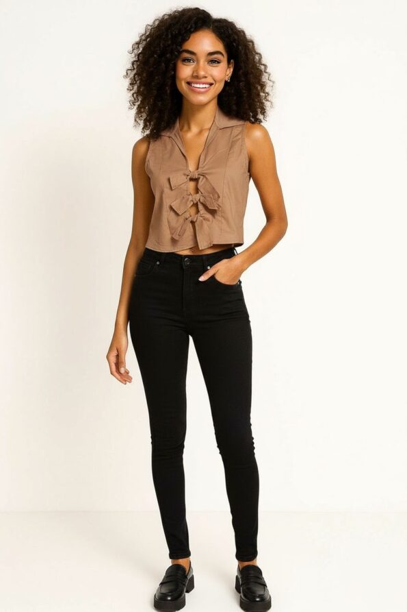 Blusa sin mangas con cuello camisero que aporta un estilo moderno y fresco, diseño frontal con tres nudos ajustables que permiten personalizar el ajuste y añaden un detalle llamativo, corte corto por encima de la cintura que estiliza y brinda un look juvenil, confección en tela ligera que asegura frescura y comodidad en todo momento, acabados reforzados que garantizan durabilidad