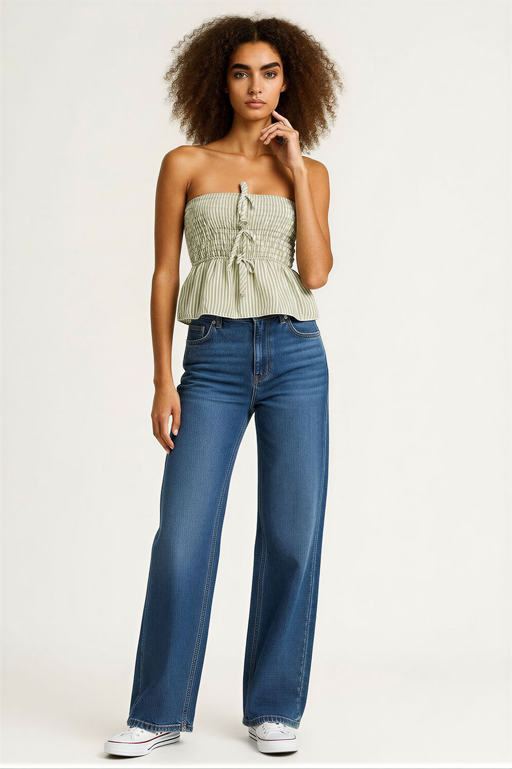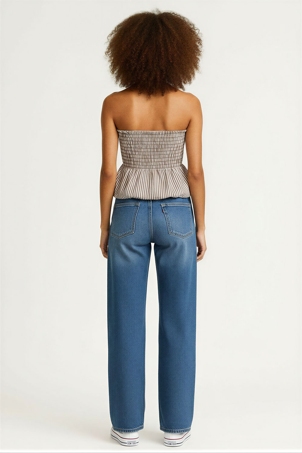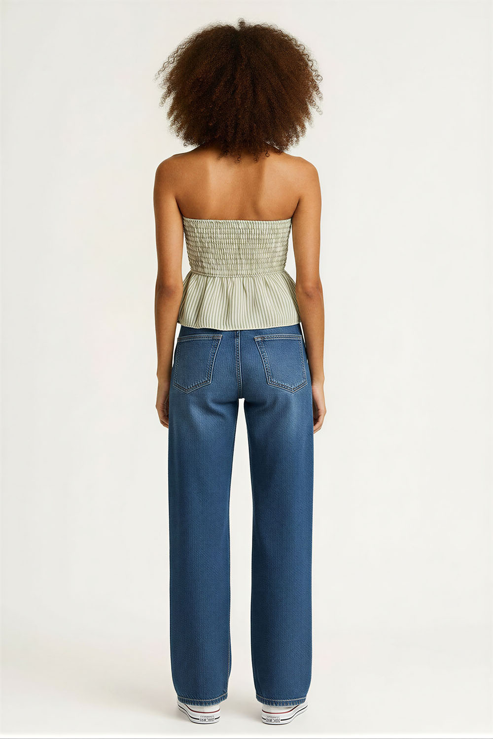 Blusa sin tirantes con cuerpo tipo smock que se ajusta al torso, escote recto que deja hombros descubiertos, corte peplum en la parte inferior que aporta volumen, diseño elástico que brinda comodidad y ajuste, confección en tela ligera que permite frescura durante el uso