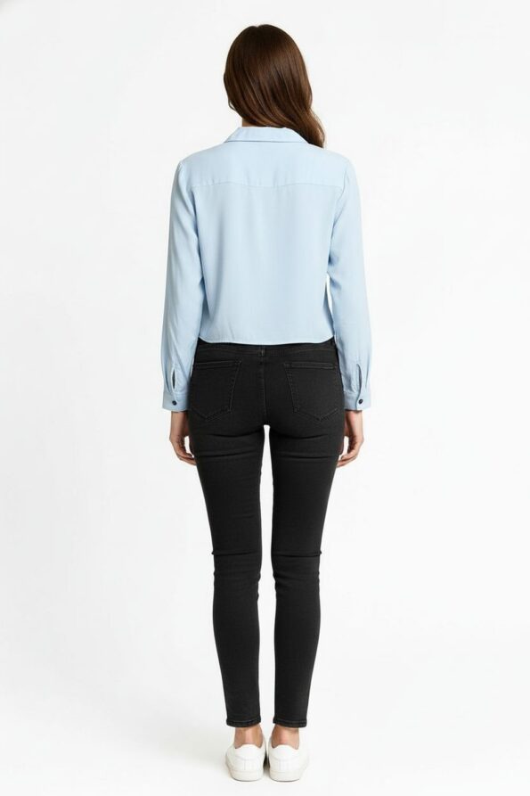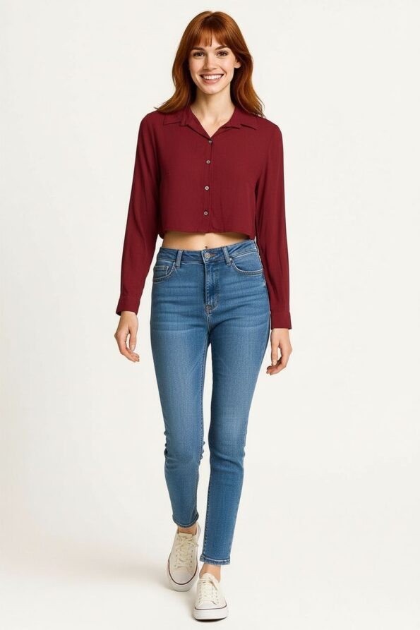 Blusa corta tipo camisera con cuello clásico que aporta un toque formal y versátil, botones al frente que permiten un cierre práctico y elegante, mangas cortas abullonadas con ligero volumen que realzan la silueta, detalle de inserción delicada en pecho que añade un acabado femenino, confeccionada en tela ligera con caída suave que brinda frescura y comodidad, ideal para combinar en outfits casuales o de oficina