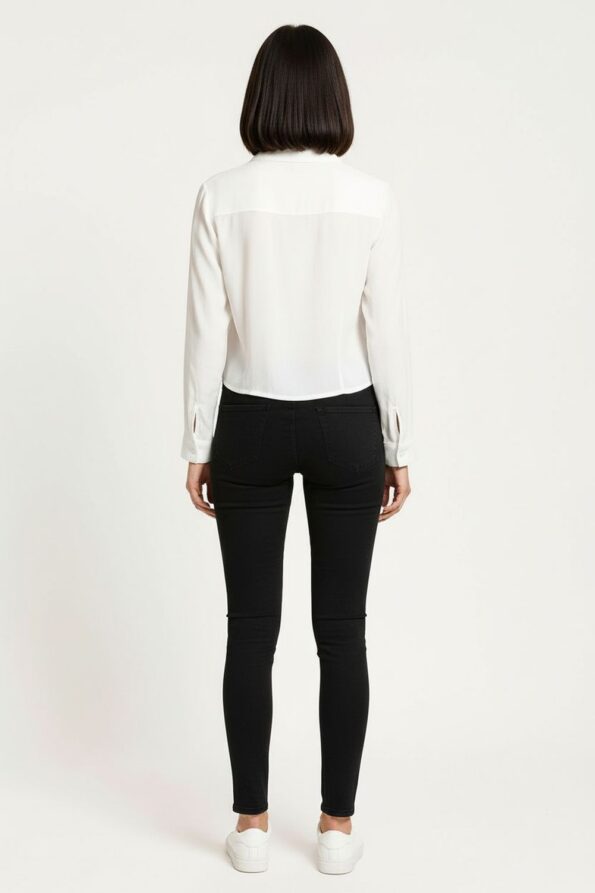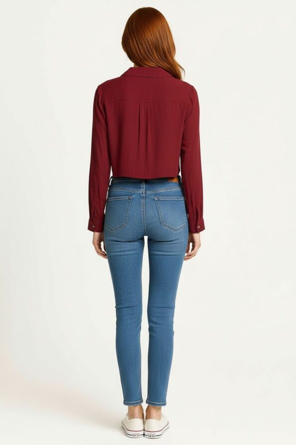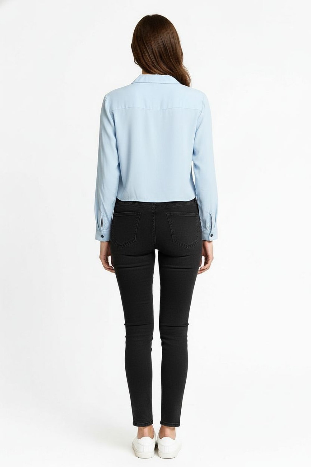 Blusa de manga larga con cuello camisero estructurado, confeccionada en tejido suave tipo wool peach que ofrece una textura aterciopelada al tacto, diseño corto con botones frontales que aportan un toque moderno, puños ajustados que brindan un acabado pulido y elegante, costuras reforzadas que garantizan confort y durabilidad