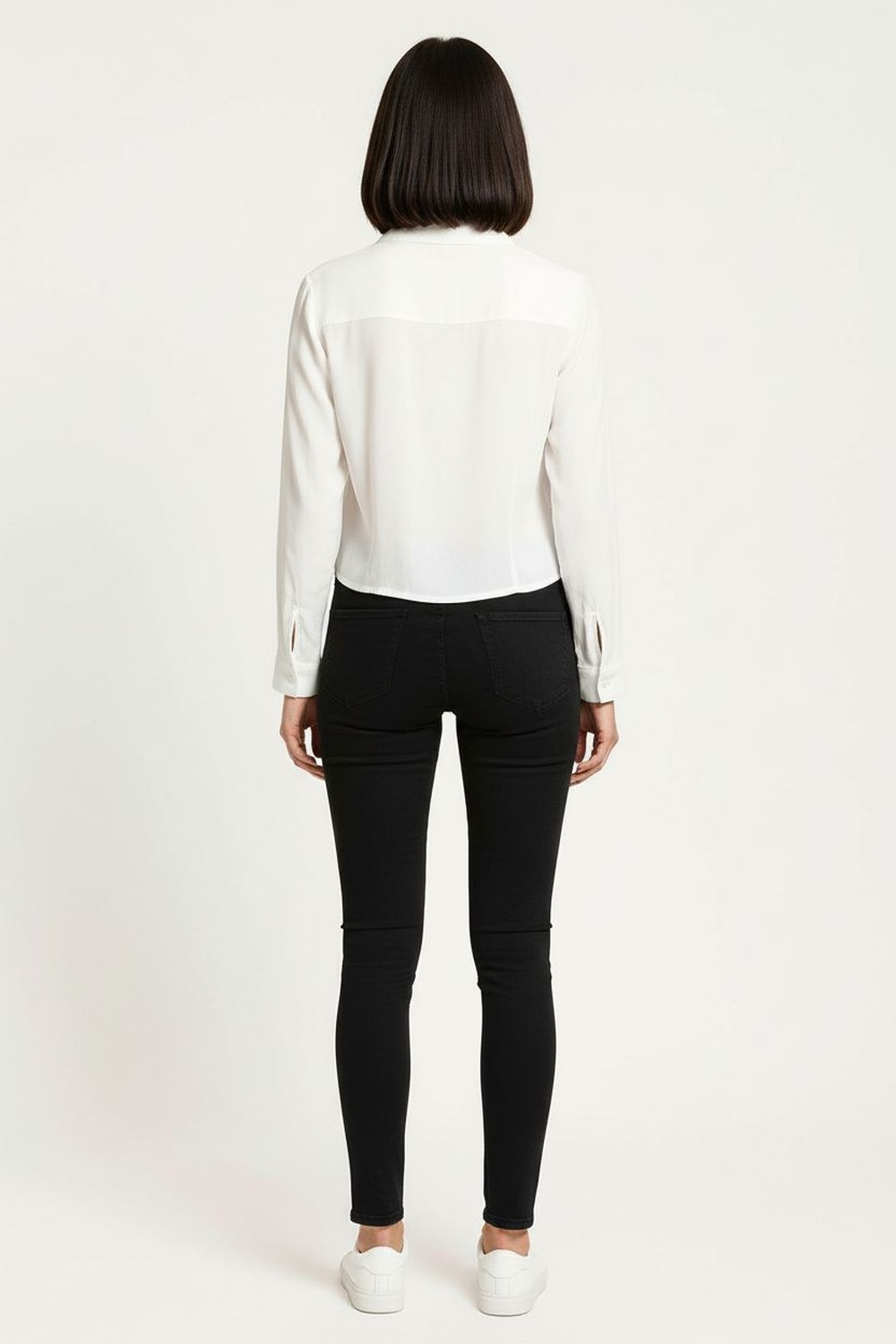 Blusa de manga larga con cuello camisero clásico que aporta elegancia, cortes en cintura que realzan la silueta y favorecen el ajuste, botonadura al frente que permite un cierre práctico y versátil, confección en tejido tipo gamuza suave que brinda comodidad y sofisticación, ideal para outfits modernos y combinaciones de temporada
